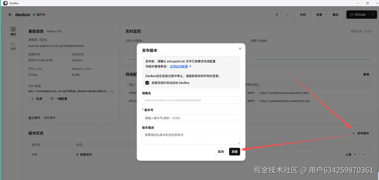 当我完成一部分开发和调试工作后,我点击了“发布版本”按钮,将当前开发环境的整个状态打包成一个标准的 OCI 镜像。