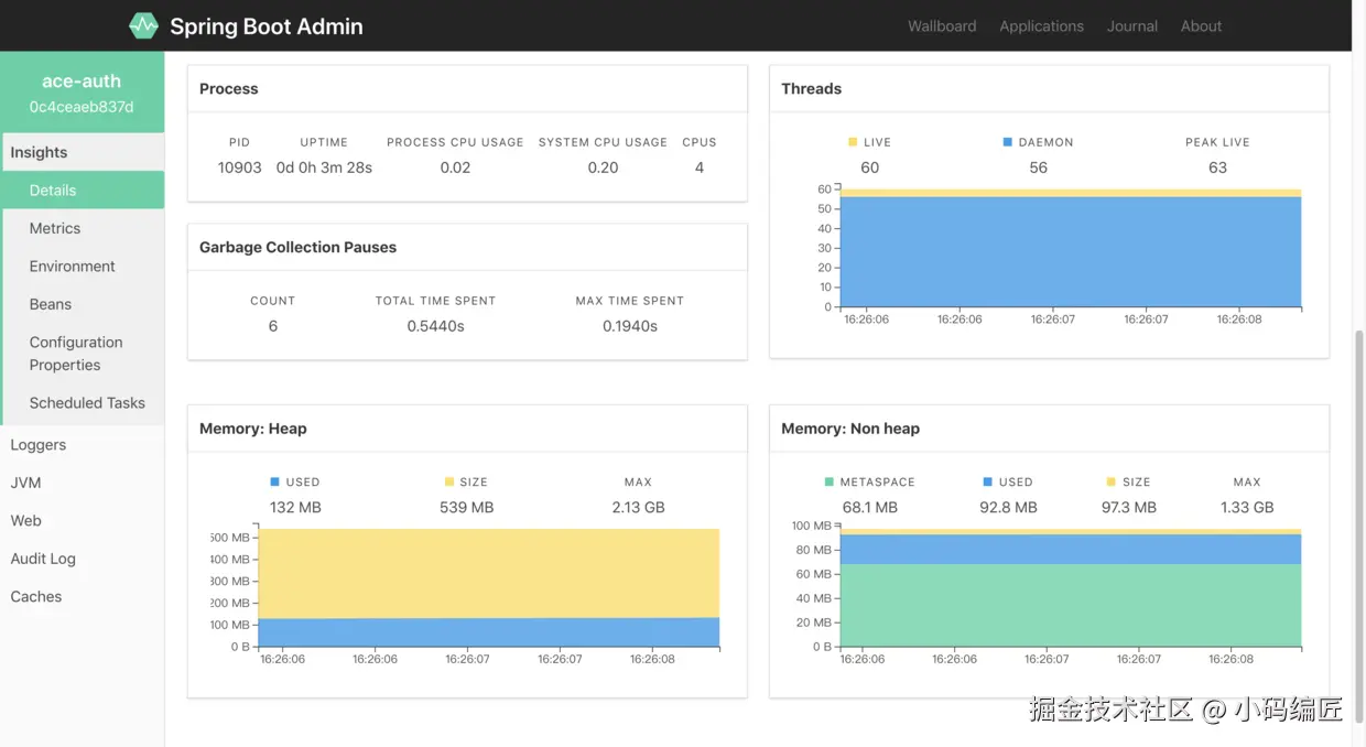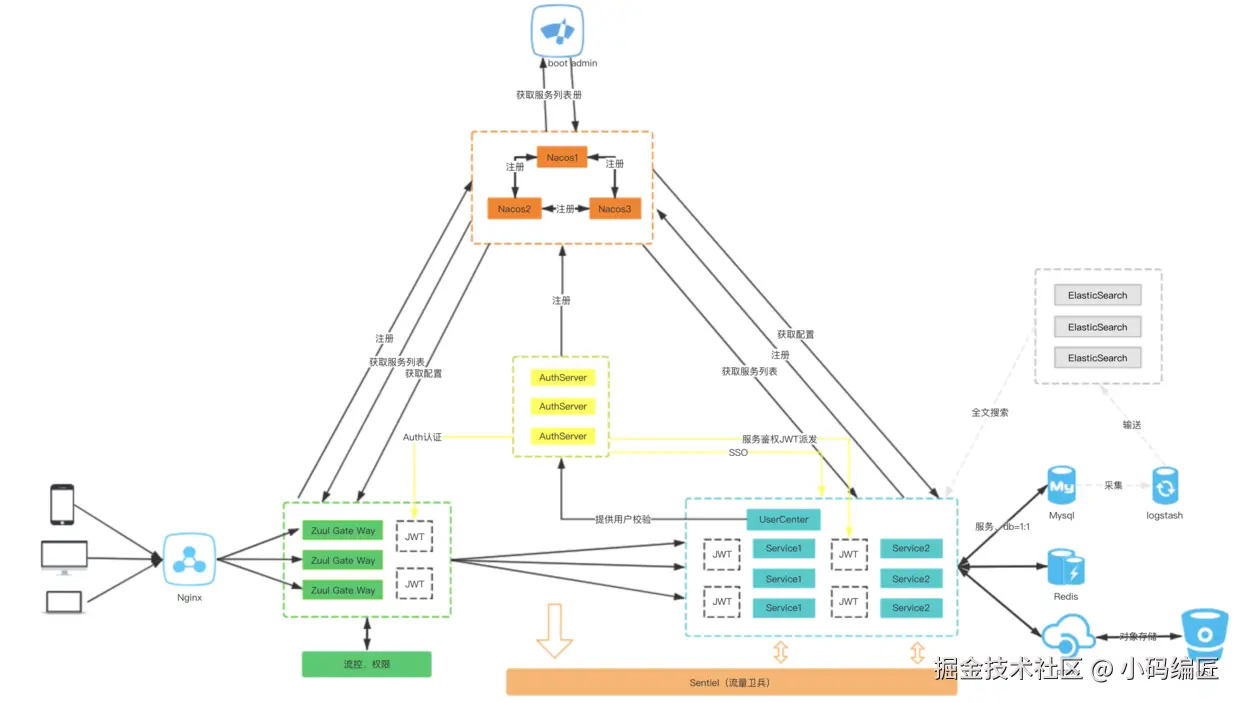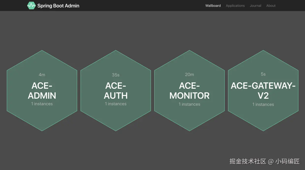利用Spring Boot Admin 来监控各个独立Service的运行状态;利用Hystrix Dashboard来实时查看接口的运行状态和调用频率等。