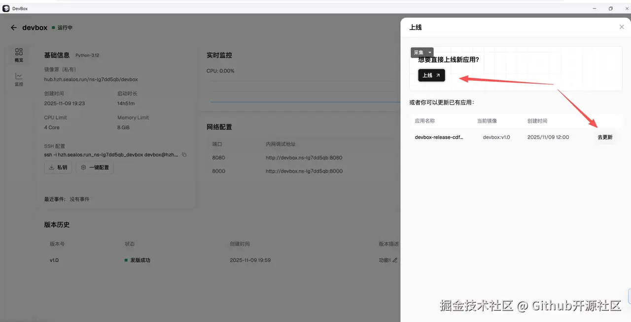 - 一键发布版本,将开发环境打包成可部署镜像。 当我完成一部分功能的开发和自测后,我直接在 DevBox 界面点击了“发布版本”按钮。系统自动将我当前开发环境的完整快照——包括我的代码、新安装的依赖包、甚至一些配置文件——打包成一个标准的 OCI 镜像,并打上了 v1.0.0 的标签。这个镜像,就是一个“可执行的、冻结了的开发环境”。