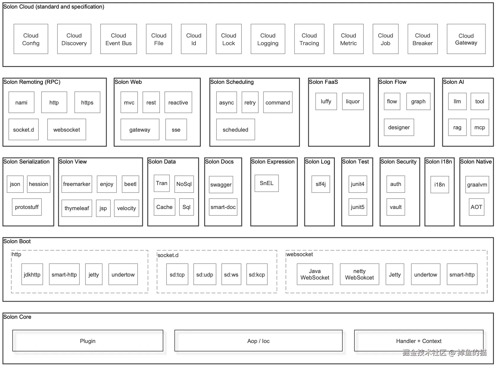 OpenSolon 是新一代,Java 企业级应用开发框架。从零开始构建(No Java-EE),有灵活的接口规范与开放生态。采用商用友好的 Apache 2.0 开源协议,是“杭州无耳科技有限公司”开源的根级项目,是 Java 应用开发的生态基座(可替换美国博通公司的 Spring 生态)。