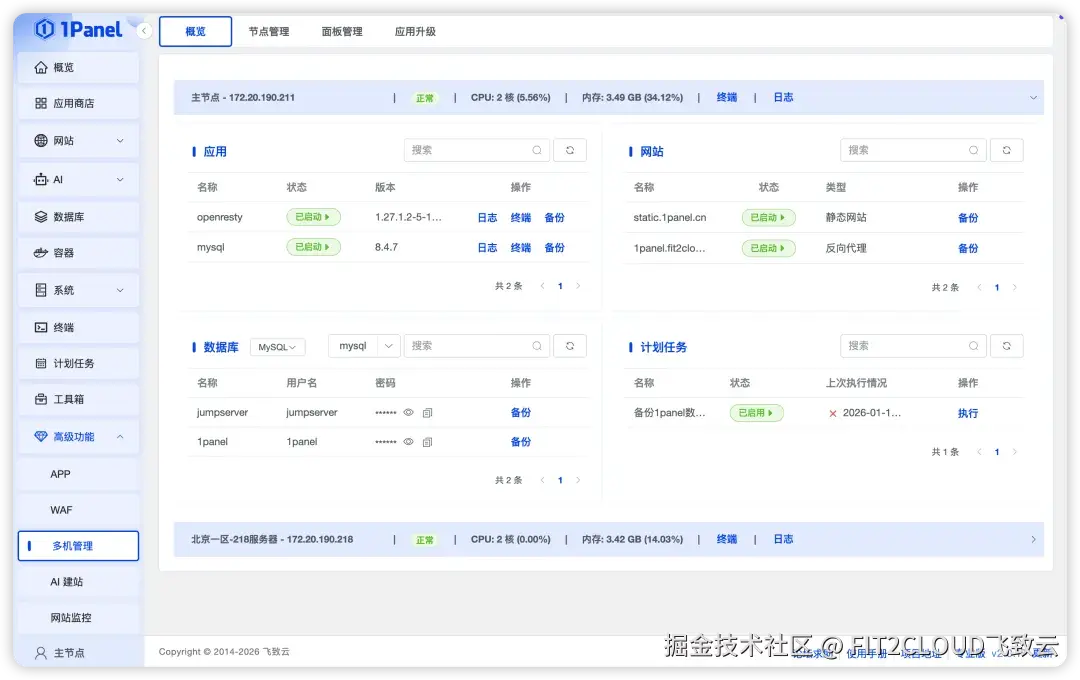 1Panel新增的多节点概览功能支持在主节点统一查看和管理各个从节点的运行情况与资源配置。通过节点概览,用户无需频繁切换节点,即可直观掌握多节点环境的整体状态。借助该功能,用户可以集中查看各节点已经部署的应用、网站、数据库及计划任务等关键信息,并且快速进行管理与运维操作。节点间的资源分布与服务状态一目了然,显著提升了多节点场景下的可视性、运维效率与集中管理能力。