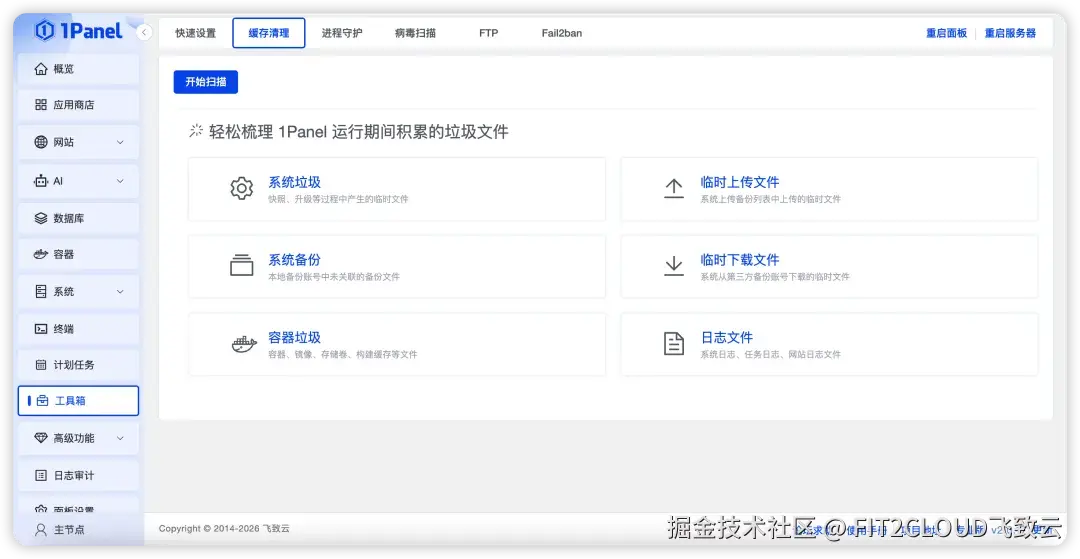在v2.0.17版本中,1Panel进一步增强了缓存与冗余数据清理能力,新增支持清理未关联的备份文件、网站日志以及应用历史版本安装包等内容。通过集中清理长期累积的无效数据,帮助用户有效释放磁盘空间,减轻磁盘占用压力。