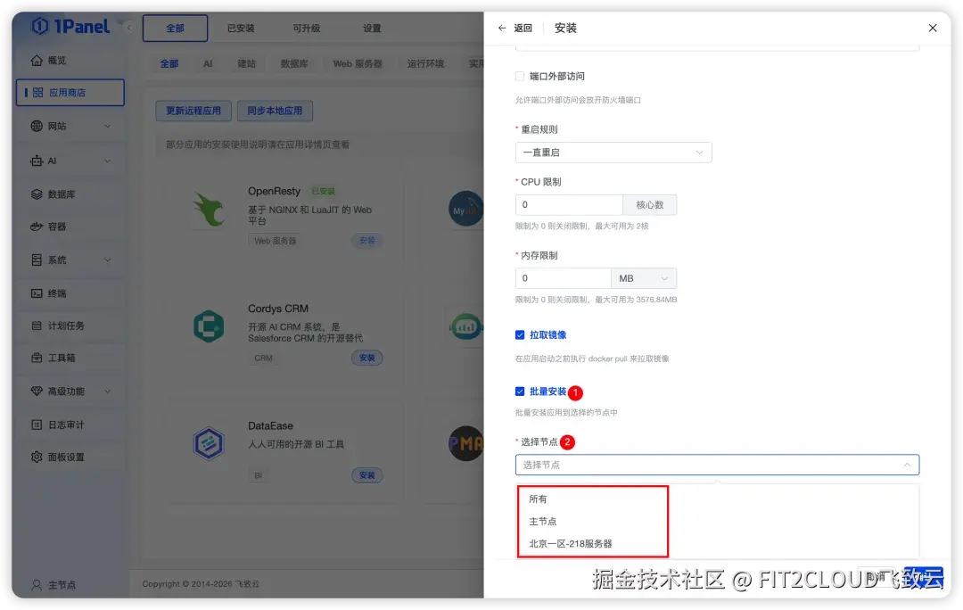 应用商店方面,1Panel新增应用多主机部署功能(X-Pack),支持在部署应用时一次选择多个目标主机统一下发,实现跨主机的应用安装与部署管理,有效提升多机环境下应用交付的效率与一致性。