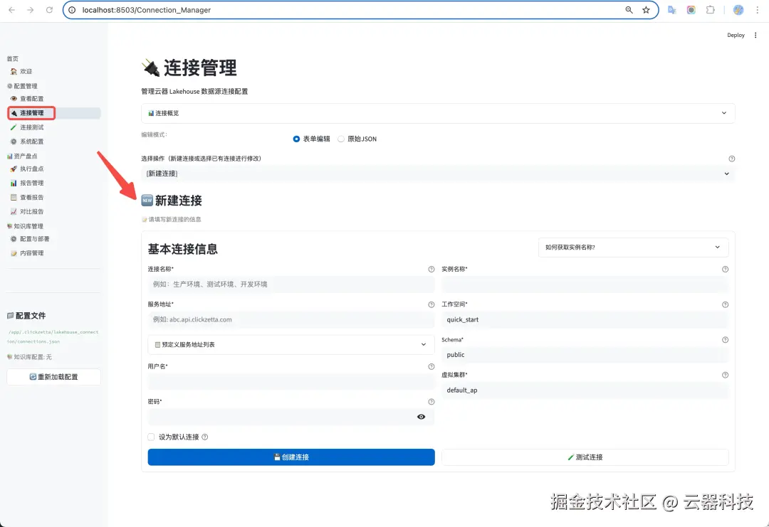 在上述路径下,新建名称为connections.json的配置文件并添加 Lakehouse 实例的连接信息,配置模板如下(如果连接两个 Lakehouse 实例,用逗号分隔):