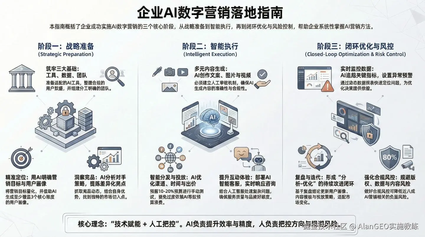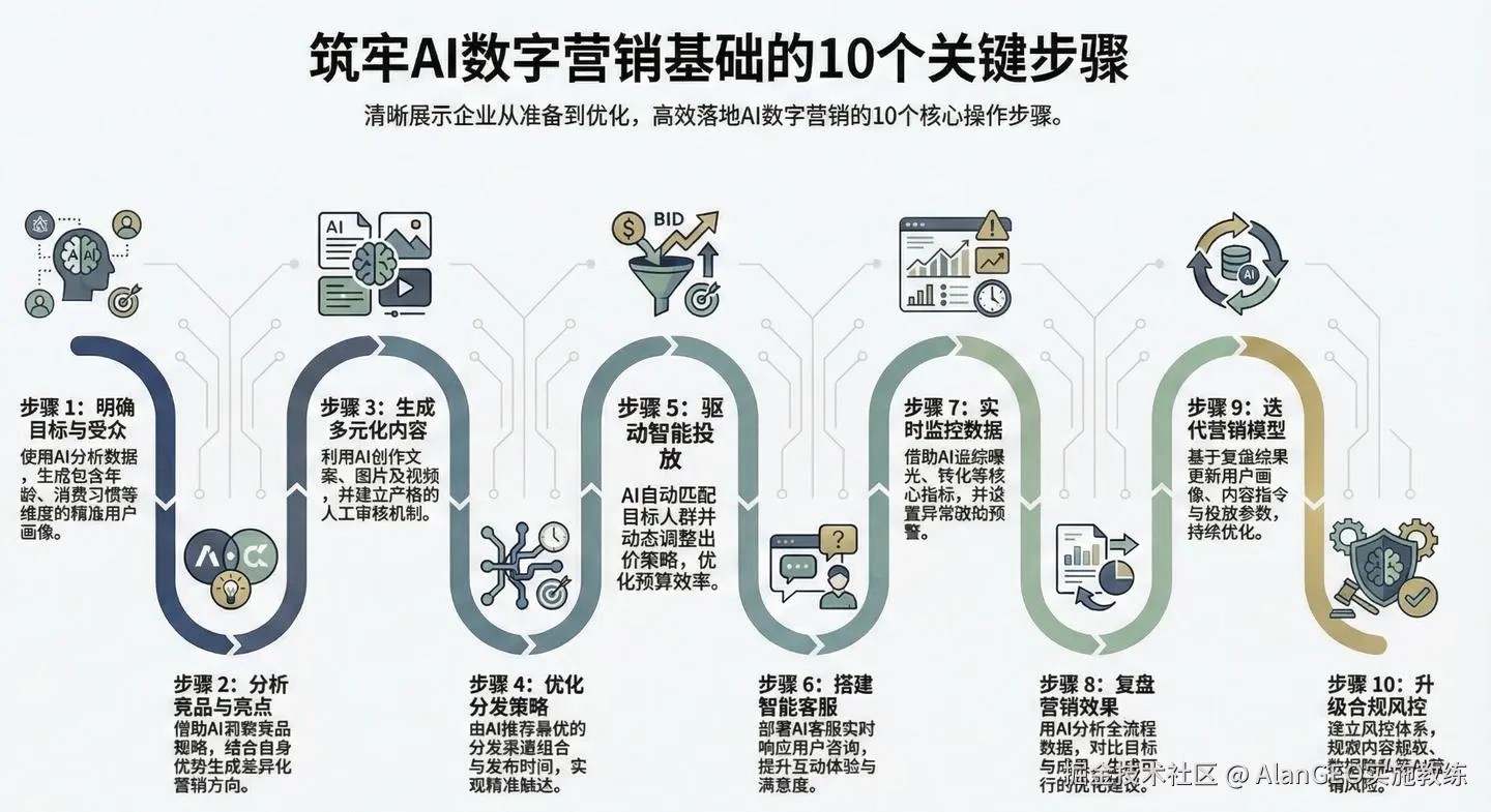 “企业利用AI进行数字营销不是盲目跟风,找对流程+控好风险才能放大效果。” 本文适配各行业企业,从准备到落地再到优化,拆解可直接复用的实操步骤,帮企业快速掌握AI赋能数字营销的核心方法。
