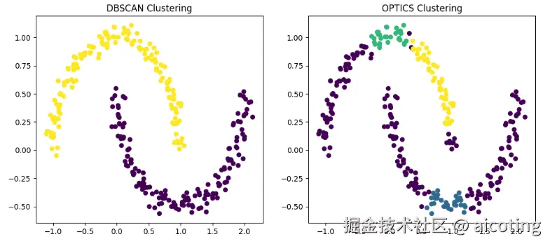 OPTICS能发现不同密度的簇,并且不需要严格指定 ε 值,适合数据密度不均匀的场景。但是计算复杂度比 DBSCAN 高,结果需要进一步分析才能确定簇边界。 下面我们用实现的代码展示一下这两种方法的效果好坏: