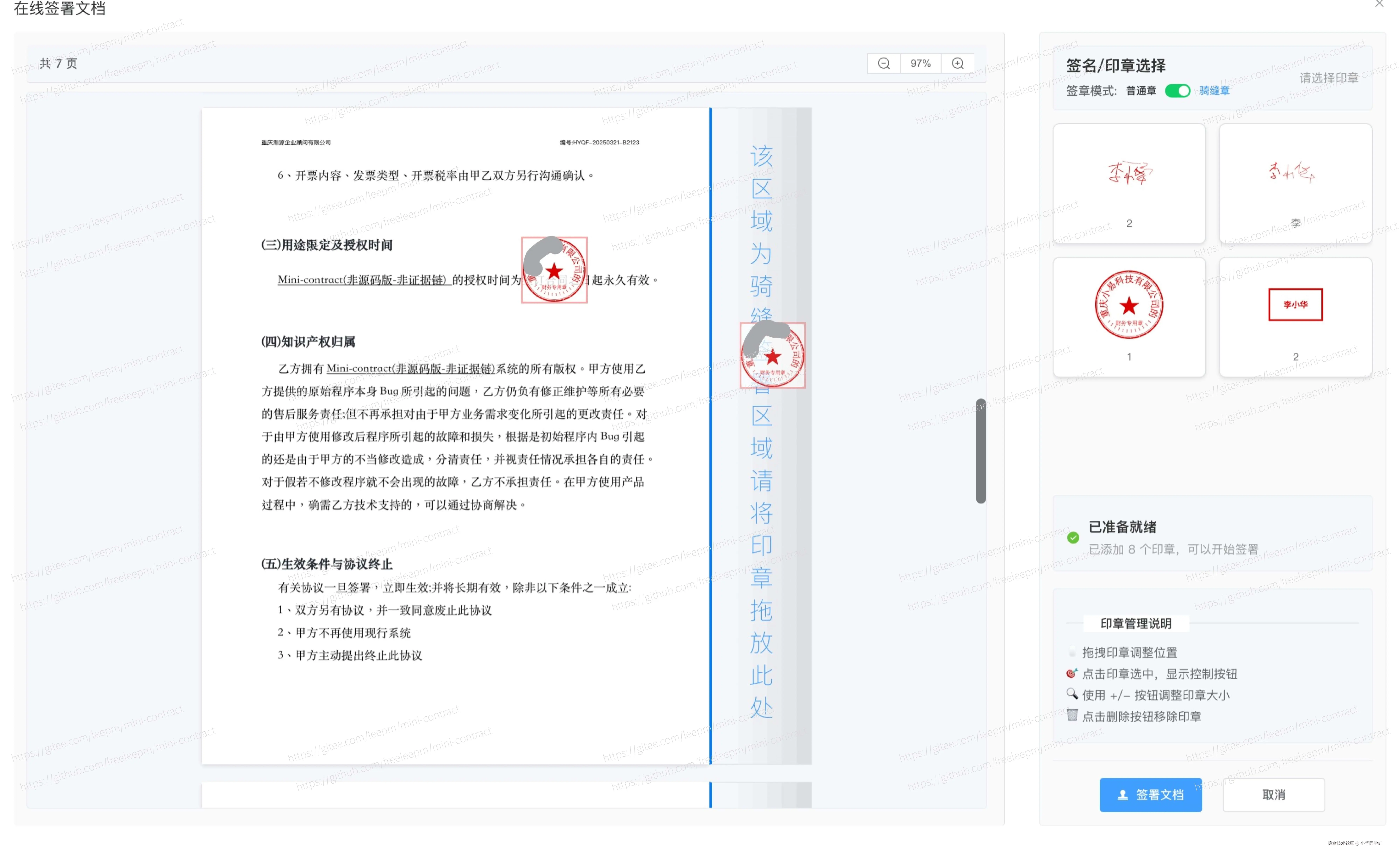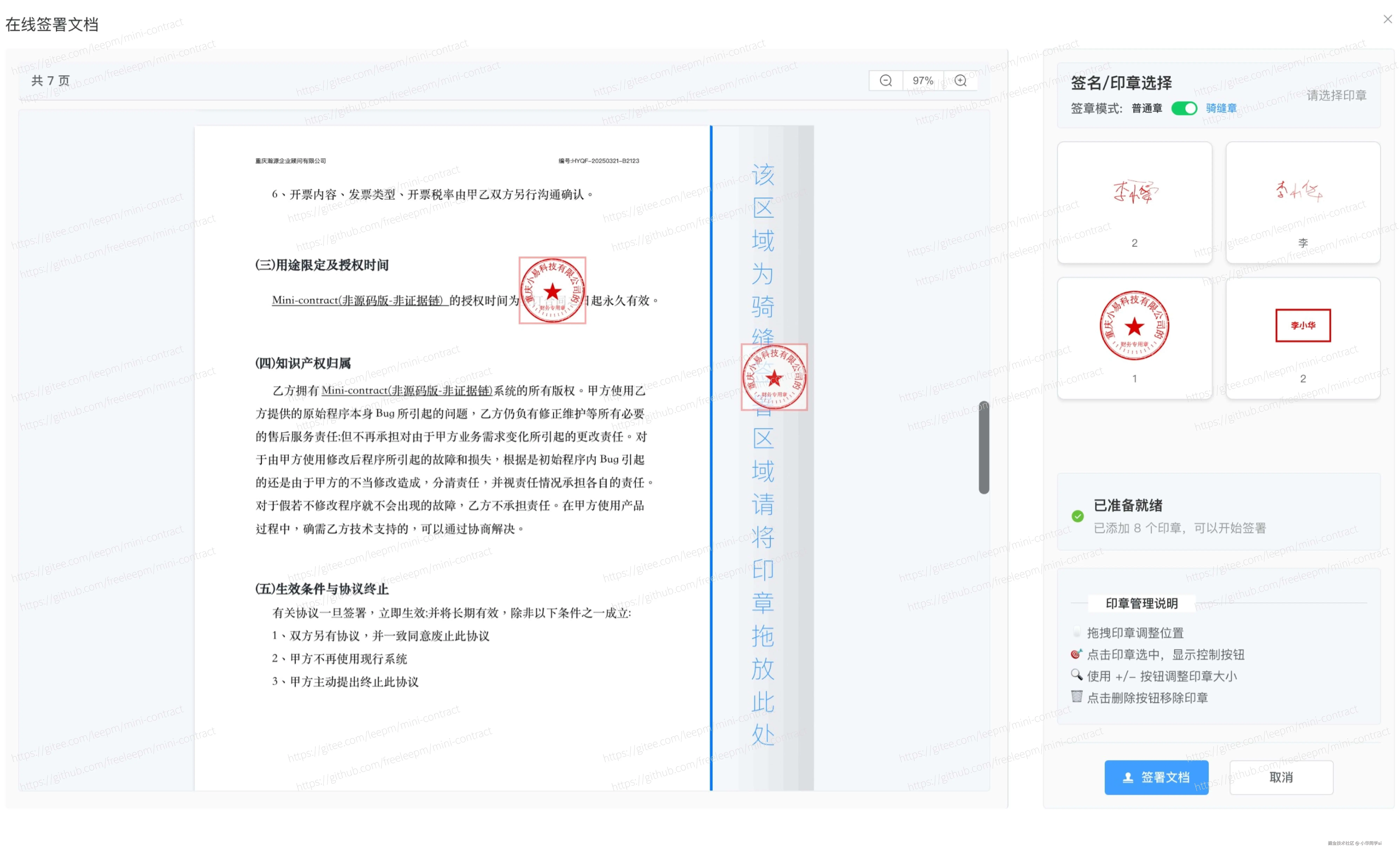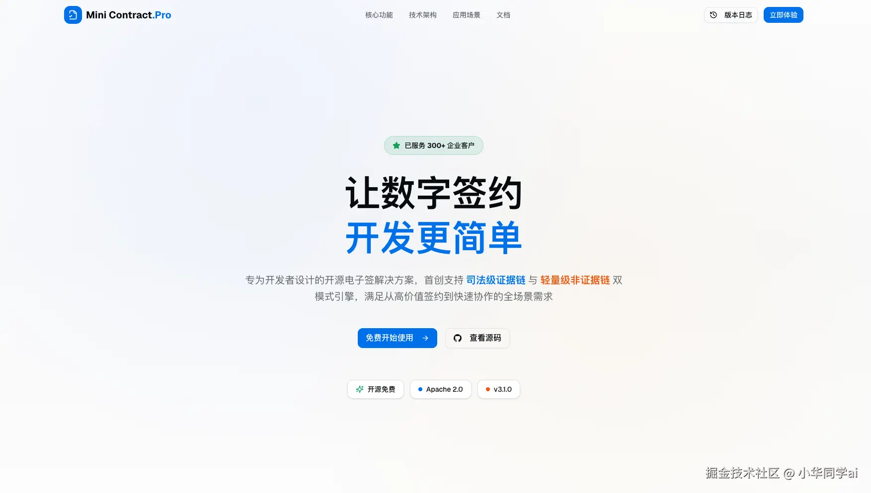 所以我做了 Mini Contract.Pro。 这是我自己的产品,也是我用真实项目标准打磨出来的一套电子签开源底座:把电子签最难的那一段(印章 + 签署 + 落章 + 存证)一次性跑通,并且做成可复用、可二开、可私有化部署的工程化能力。 目前已服务了300+真实客户。