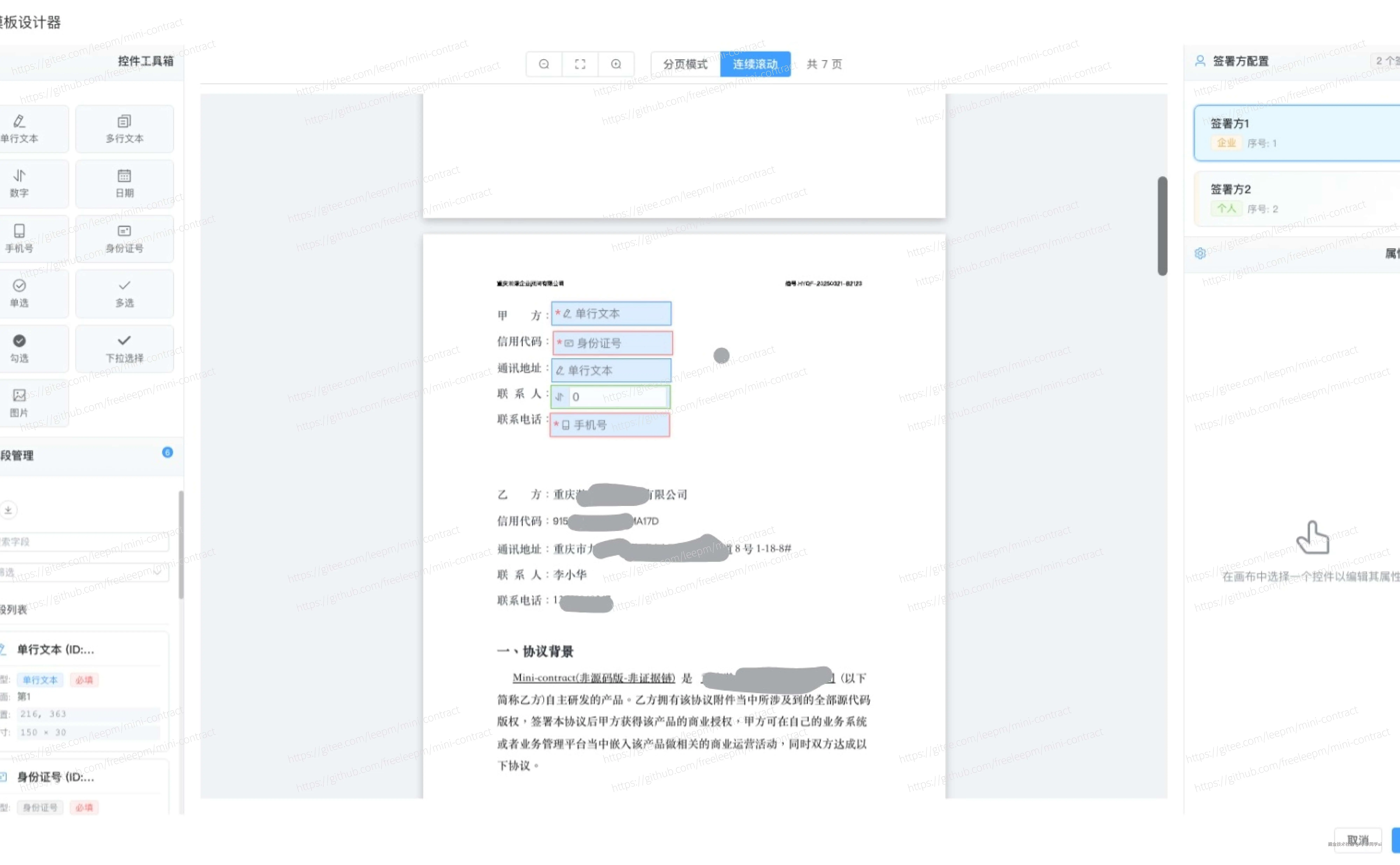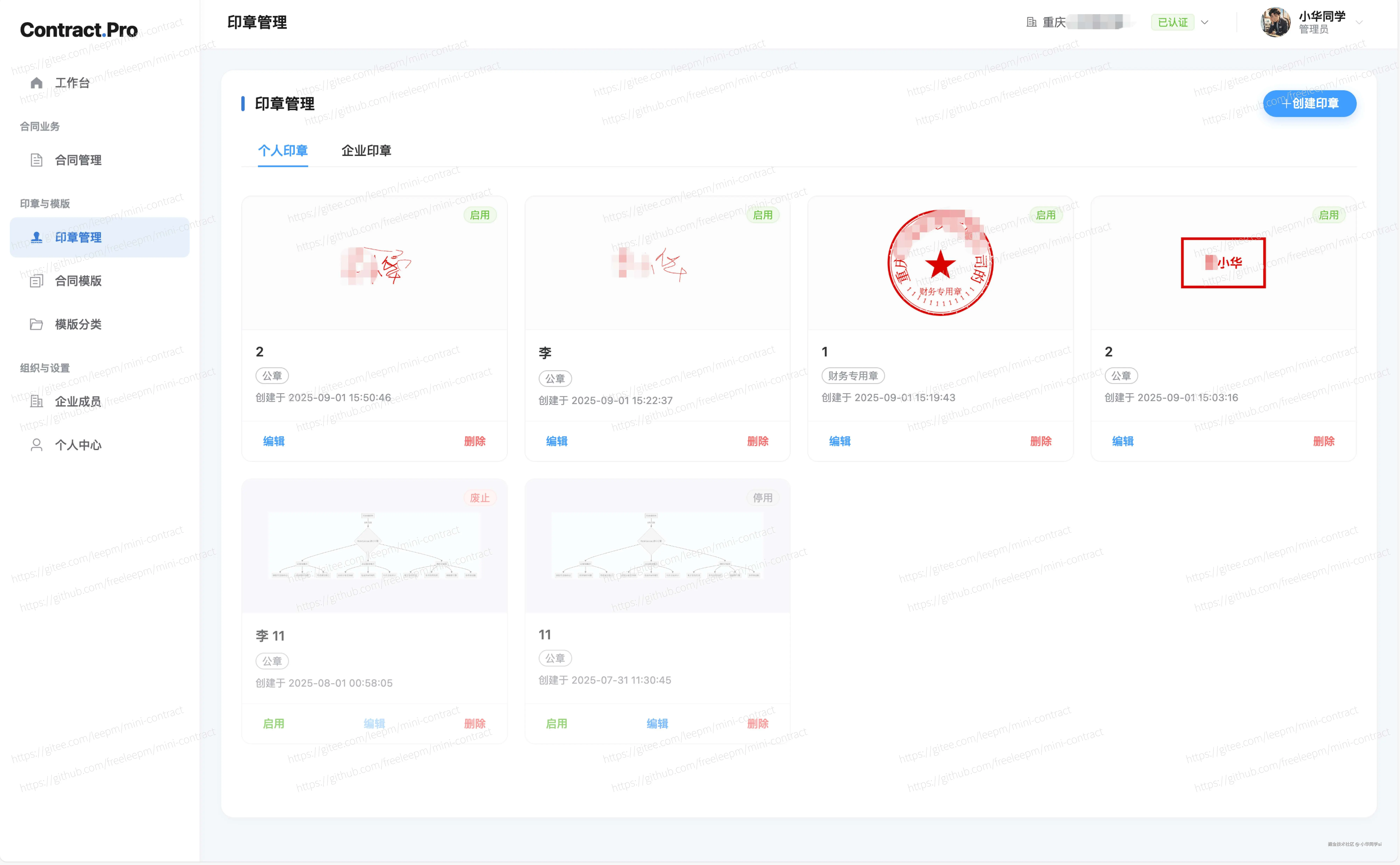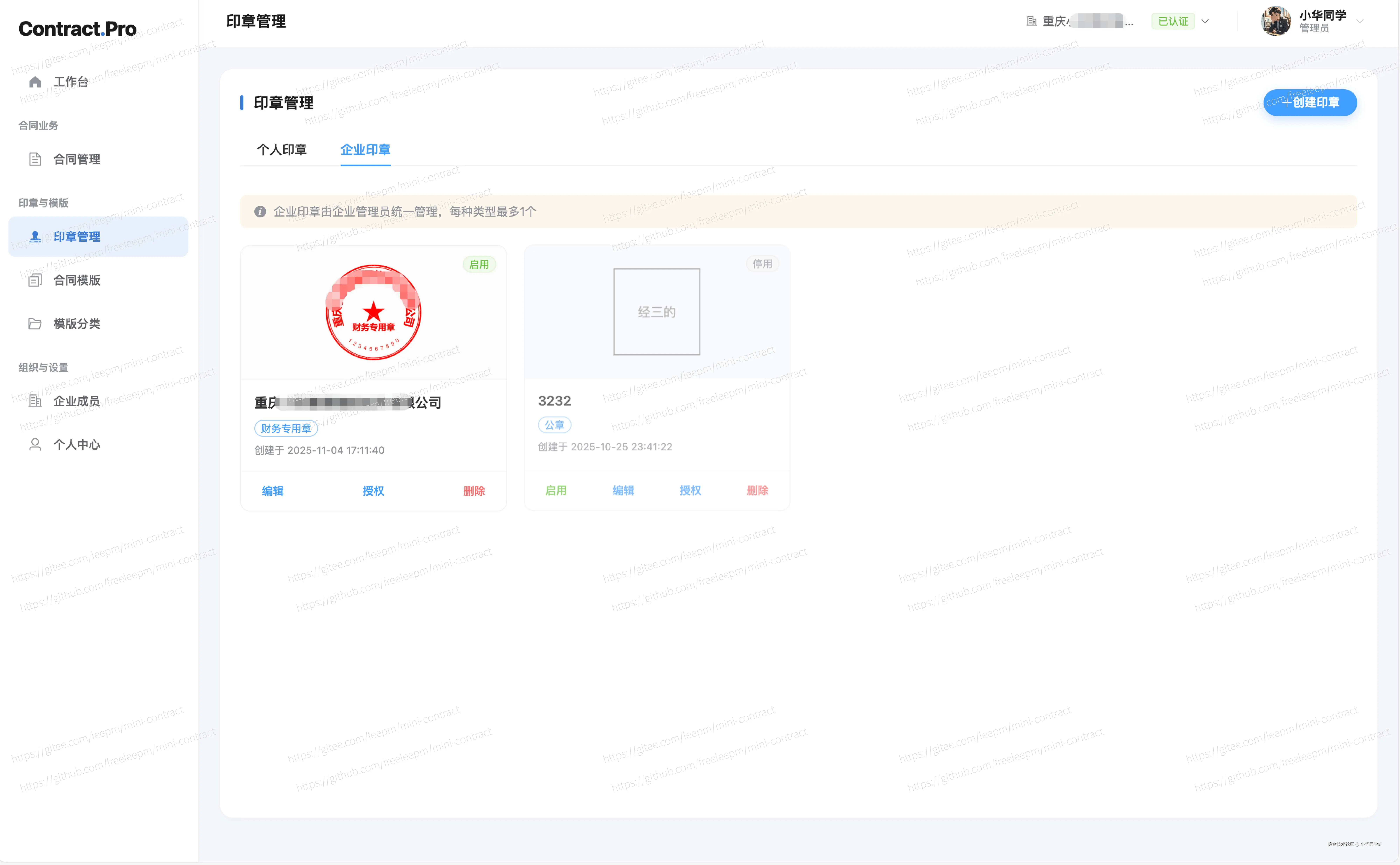 所以我做了 Mini Contract.Pro。 这是我自己的产品,也是我用真实项目标准打磨出来的一套电子签开源底座:把电子签最难的那一段(印章 + 签署 + 落章 + 存证)一次性跑通,并且做成可复用、可二开、可私有化部署的工程化能力。 目前已服务了300+真实客户。