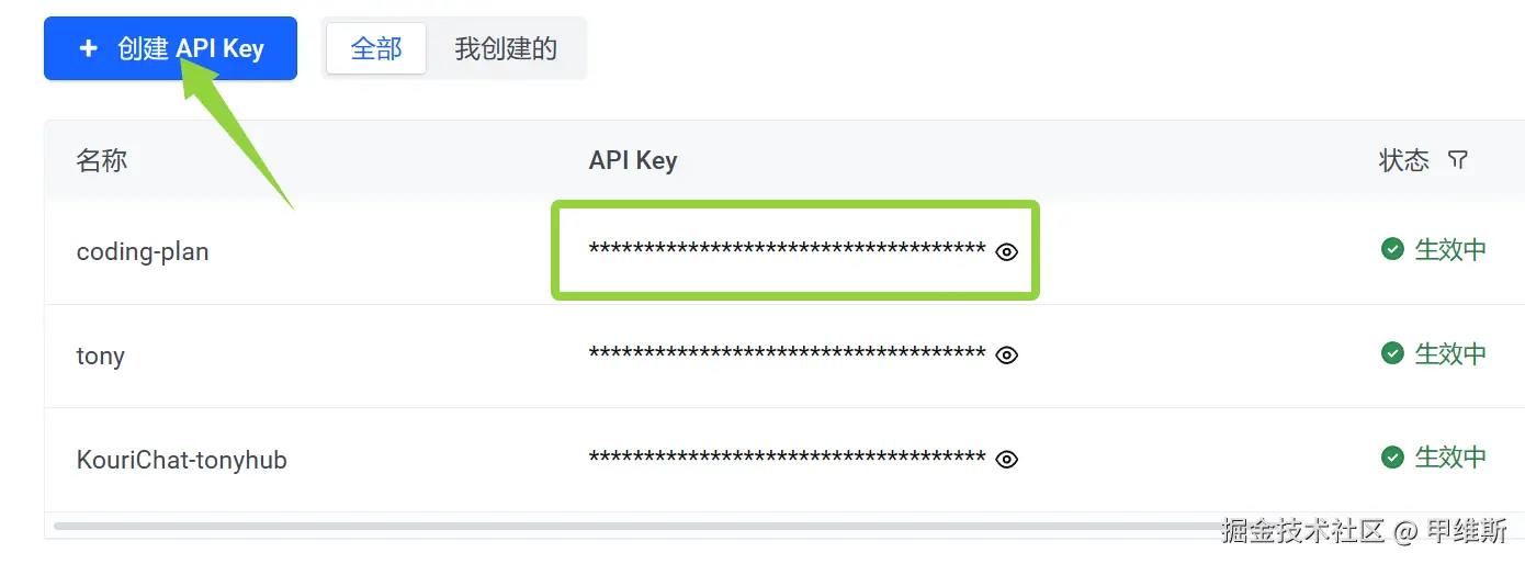 打开地址之后,可以创建一个单独的 key。比如叫 coding-plan。
