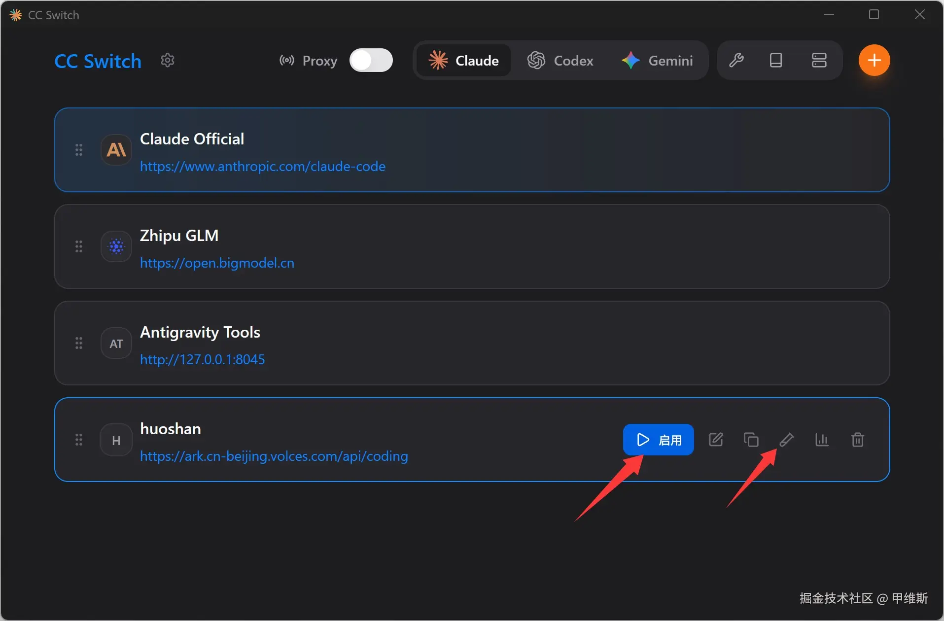 一旦配置完成之后,切换模型非常方便。如果启用了 Proxy,更加是可以实现无缝切换。除了 Claude Code 之外还可以切换 Codex 和 Gemini 的模型。