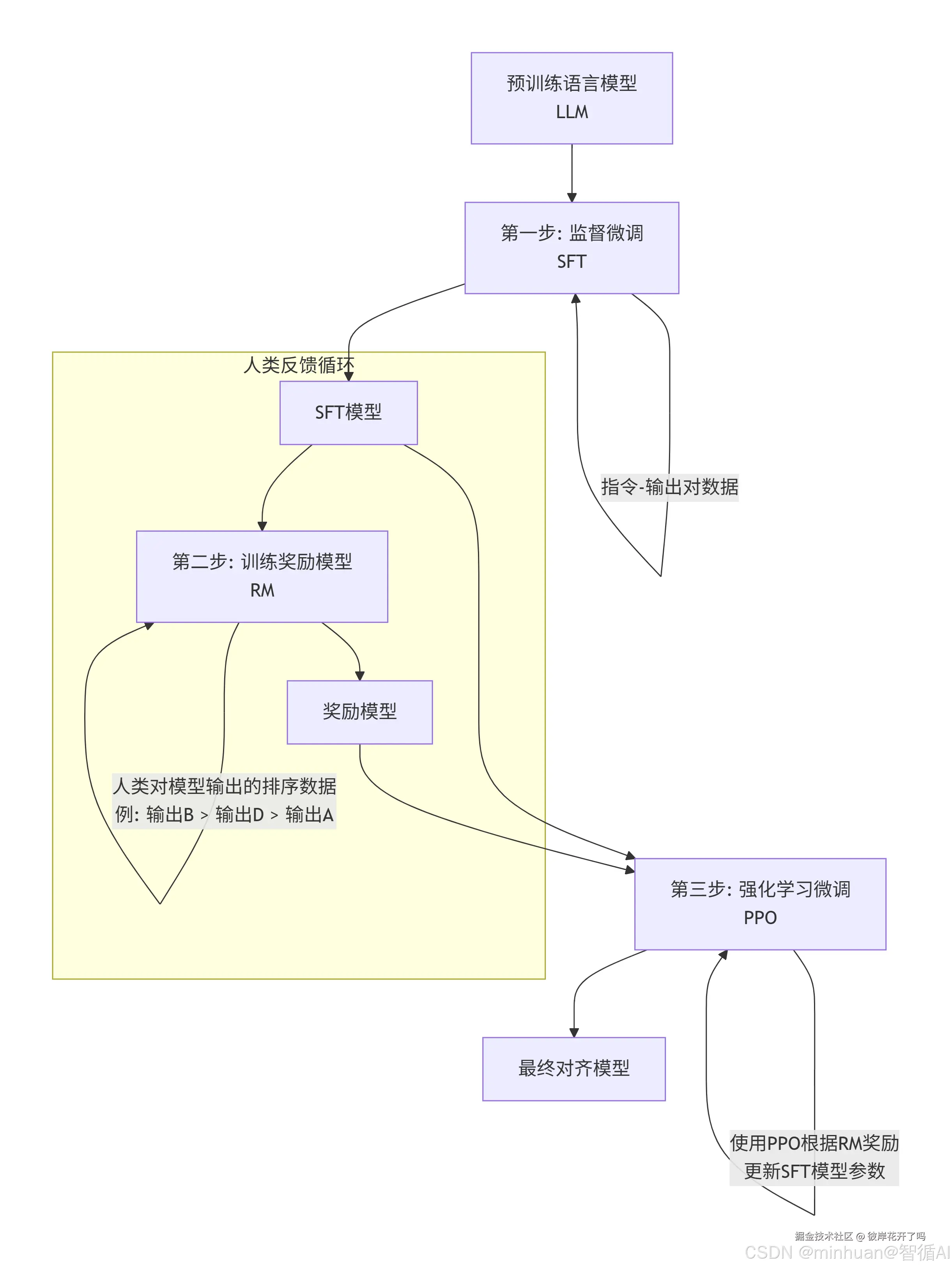 **1. 监督微调(SFT):**这就是我们上面人类对齐中完成的指令微调步骤,它产出一个基础的对齐模型,能够理解和遵循指令。