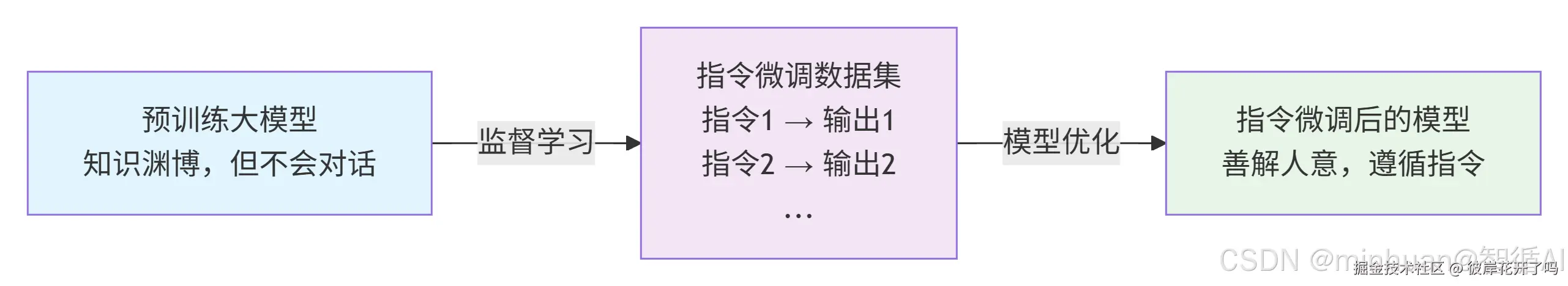 指令微调就像一个调教过程,预训练模型虽然知识丰富,但不懂规矩,我们通过高质量的指令数据集,手把手地教它当人类给出某种指令时,应该如何回应,经过学习,模型就变成了一个懂得遵循指令、善解人意的优秀助手。