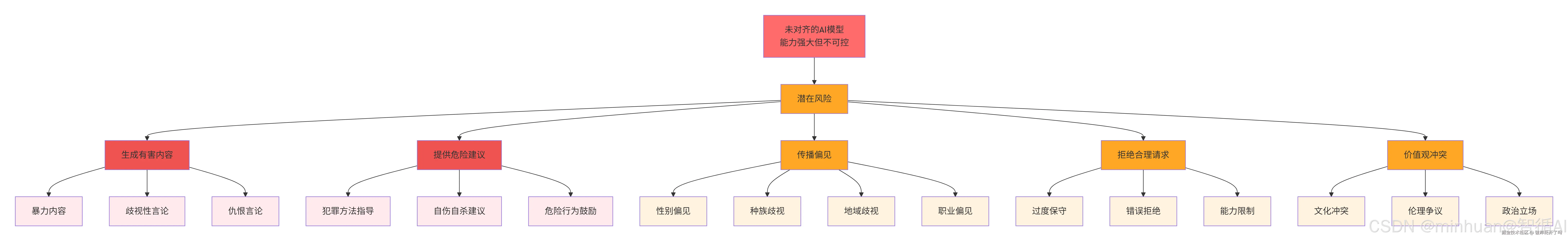 这个流程图清晰地展示了未对齐AI模型可能带来的各种风险:
