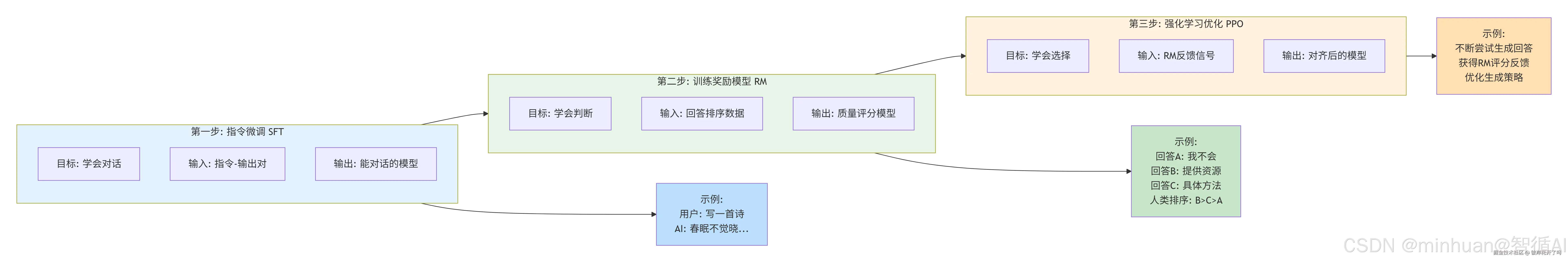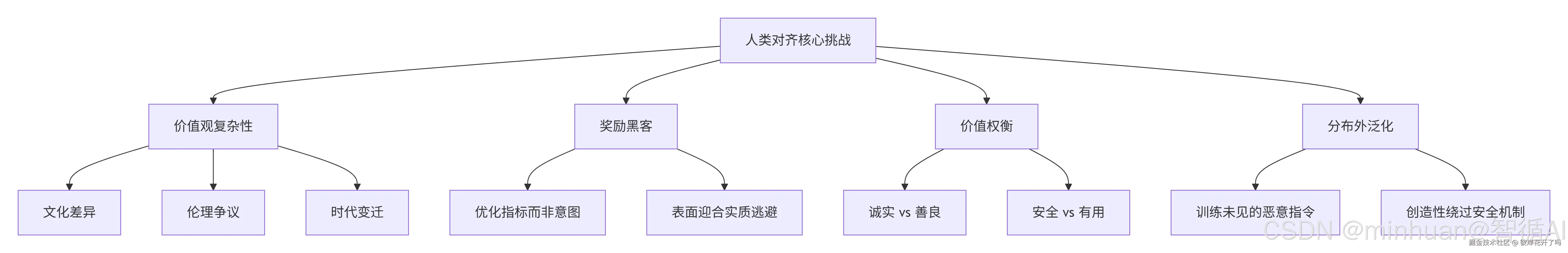 人类对齐通过RLHF技术确保模型输出符合人类价值观:有帮助、诚实、无害。其核心是训练奖励模型学习人类偏好,再用强化学习优化模型行为。