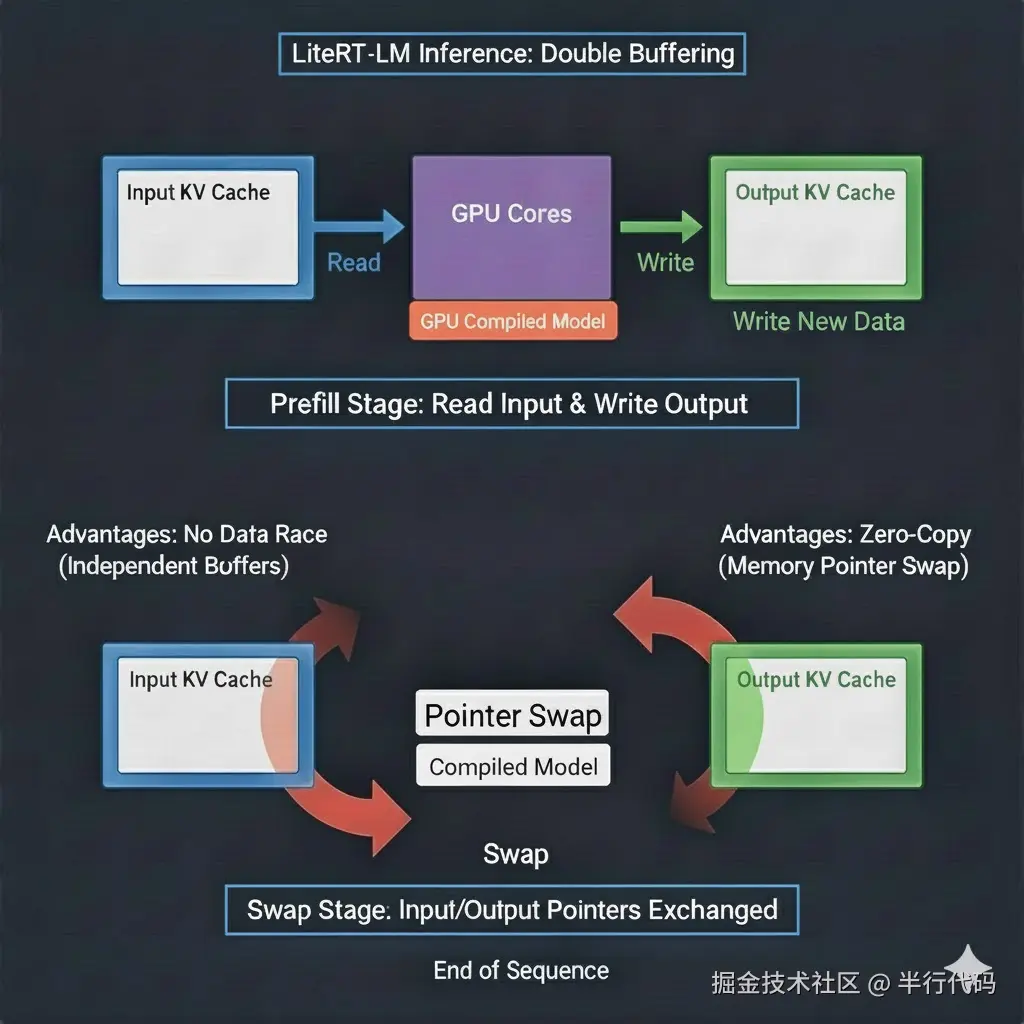 在 LlmLiteRtCompiledModelExecutorStatic 的 Prefill 中,设置了2个KV Cache 缓冲区,来解决 GPU 后端无法同时读写同一段缓冲区的问题。