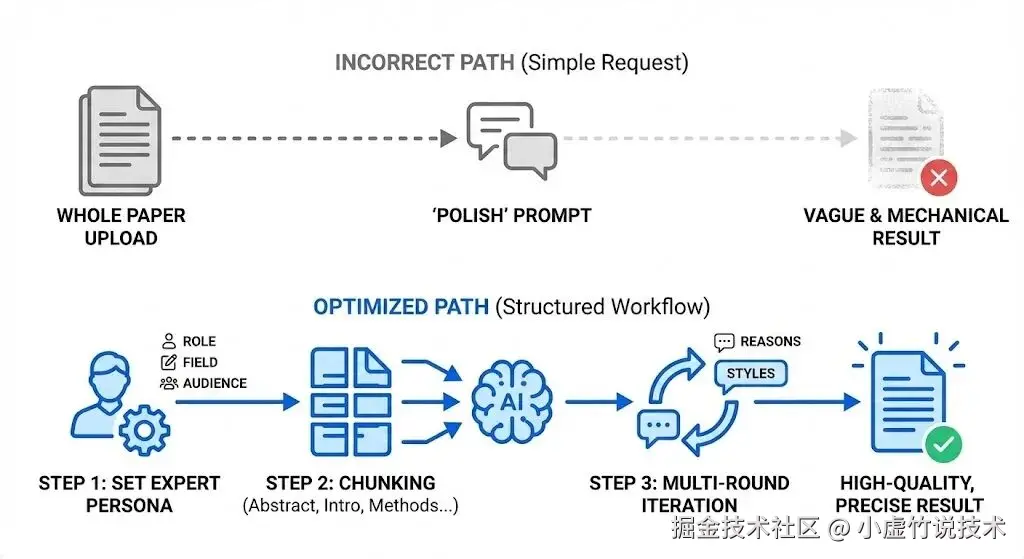 如果只是把整篇论文一股脑丢给 AI,让它“随便润色一下”,结果大概率会很虚,甚至一眼就能看出是机器味翻译🤖。想要真正好用,步骤一定要讲究。
