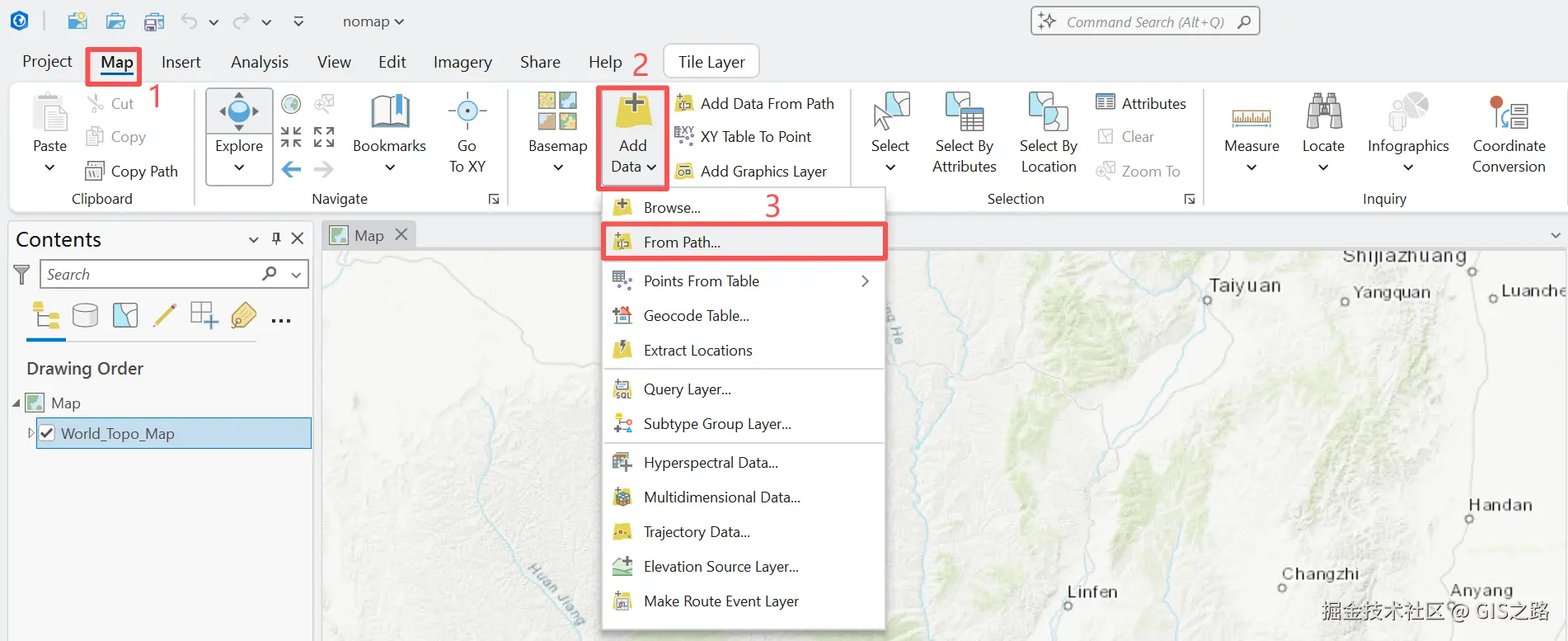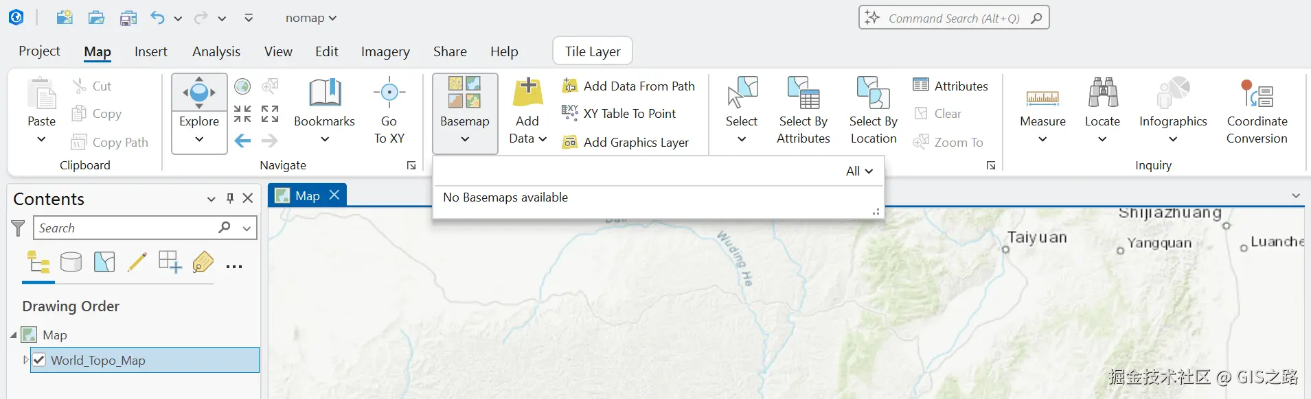 之前通过Map菜单下的Basemap选项便可以直接添加底图,便捷又省力。可恶的是我的底图这里竟然是空空如也,连天地图也消失不见。