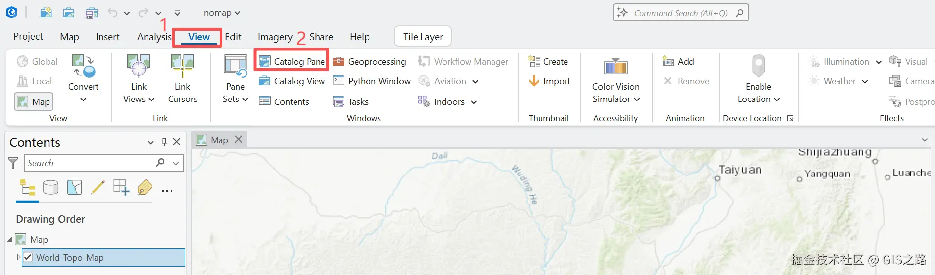 首先点击菜单栏View选项,然后打开Catalog Pane。