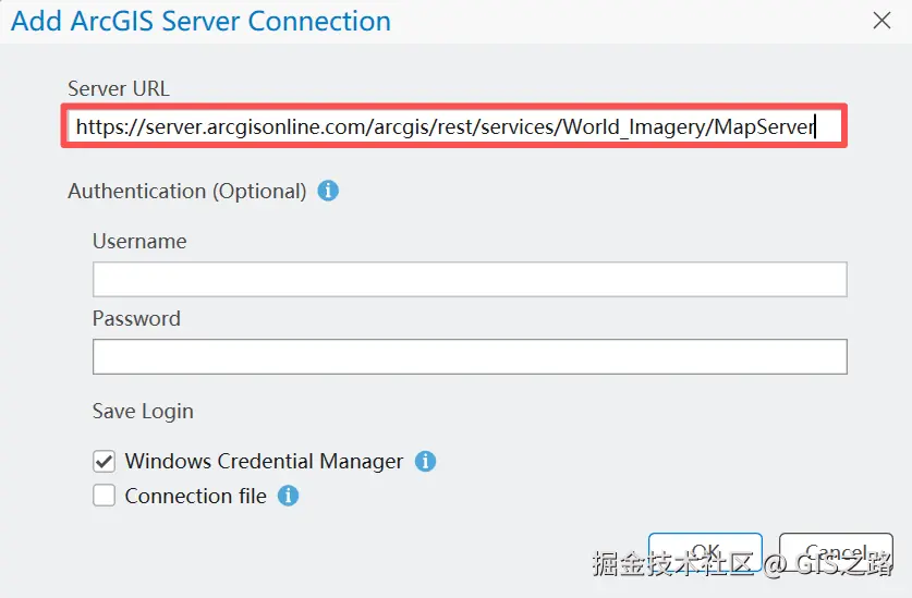 在添加服务对话框中输入地址:https://server.arcgisonline.com/arcgis/rest/services/World_Imagery/MapServer,然后点击OK。