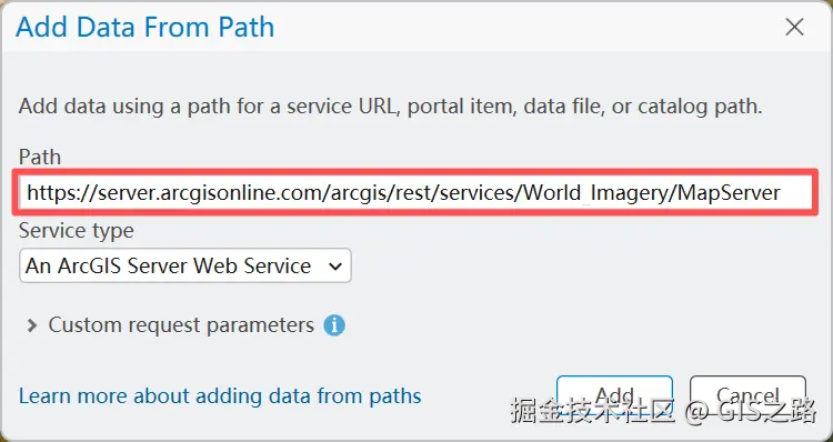 然后再添加数据对话框中填入地址:https://server.arcgisonline.com/arcgis/rest/services/World_Imagery/MapServer,然后点击Add。