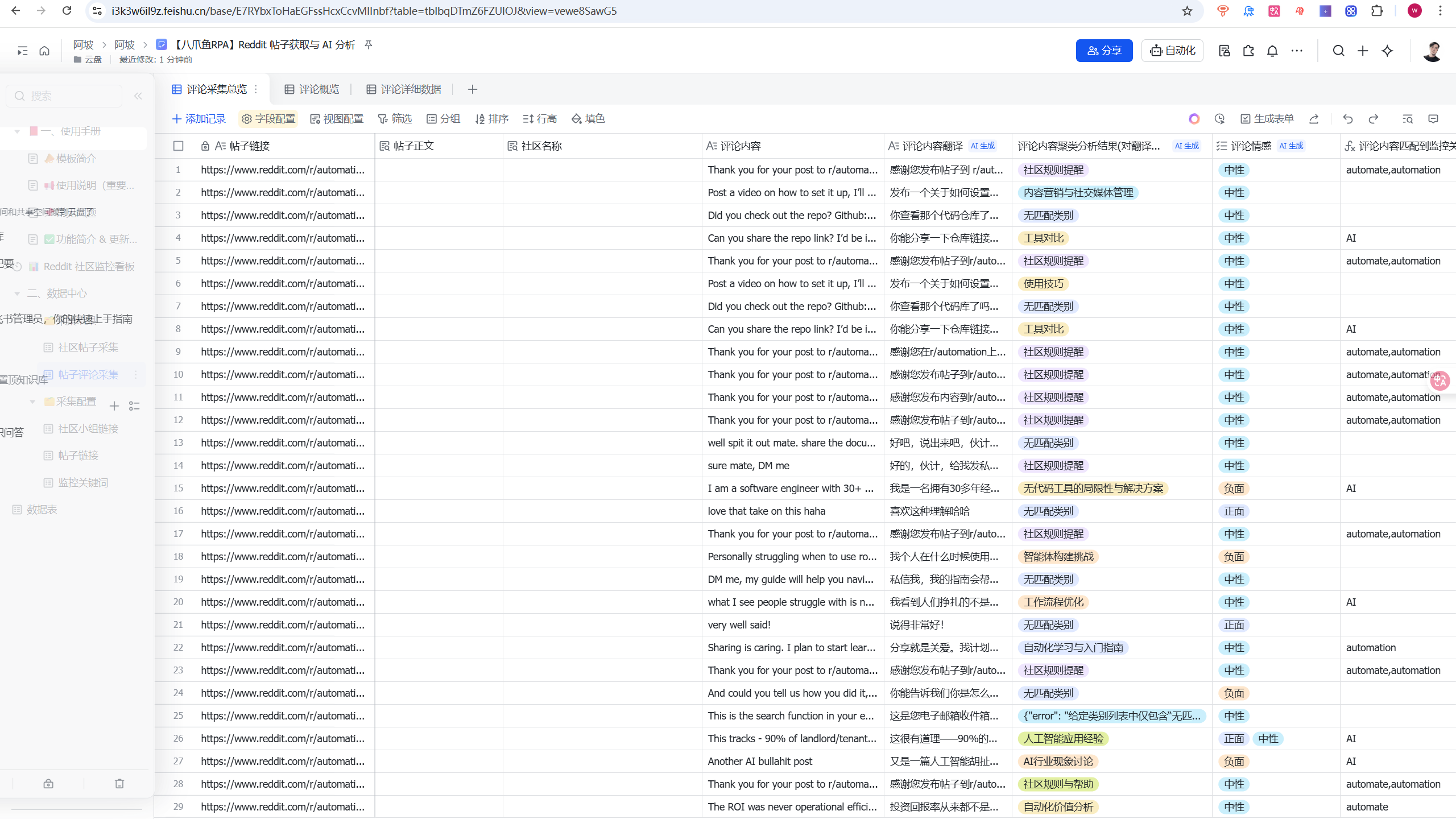现在,你已拥有了一套开箱即用的自动化舆情监控解决方案。它深度整合了 Reddit 数据采集与飞书多维表格/BI 看板,能够持续为你完成关键词与热门帖的舆情监控,将你从繁琐、重复的社群数据搬运工作中彻底解放,使舆情监控变得系统、高效且一目了然。