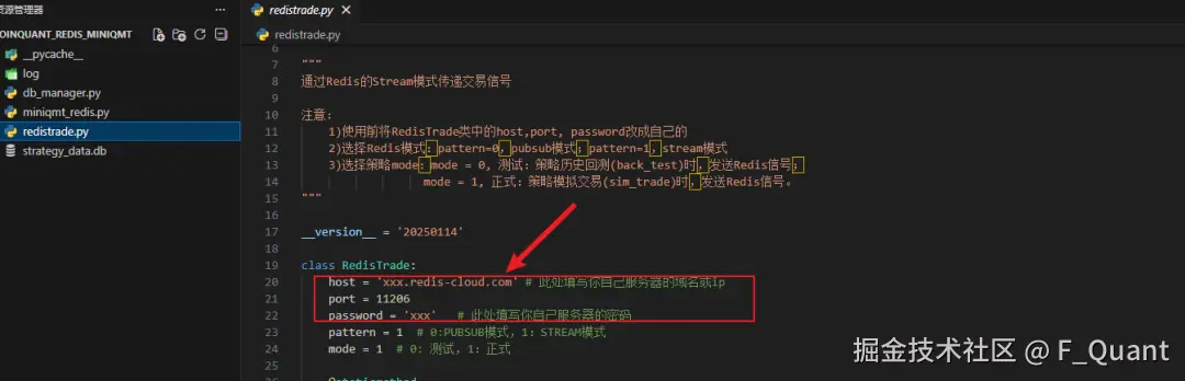 中间件 :去买个 Redis 云服务或者自己购买云服务器搭(更推荐)【需要将参数填到 redistrade.py 与 miniqmt_redis.py 中 】。 请自行学习,简单,网上教程很多。 有兄弟 实在不知道怎么弄,也可以联系我, 尽量自己解决 。