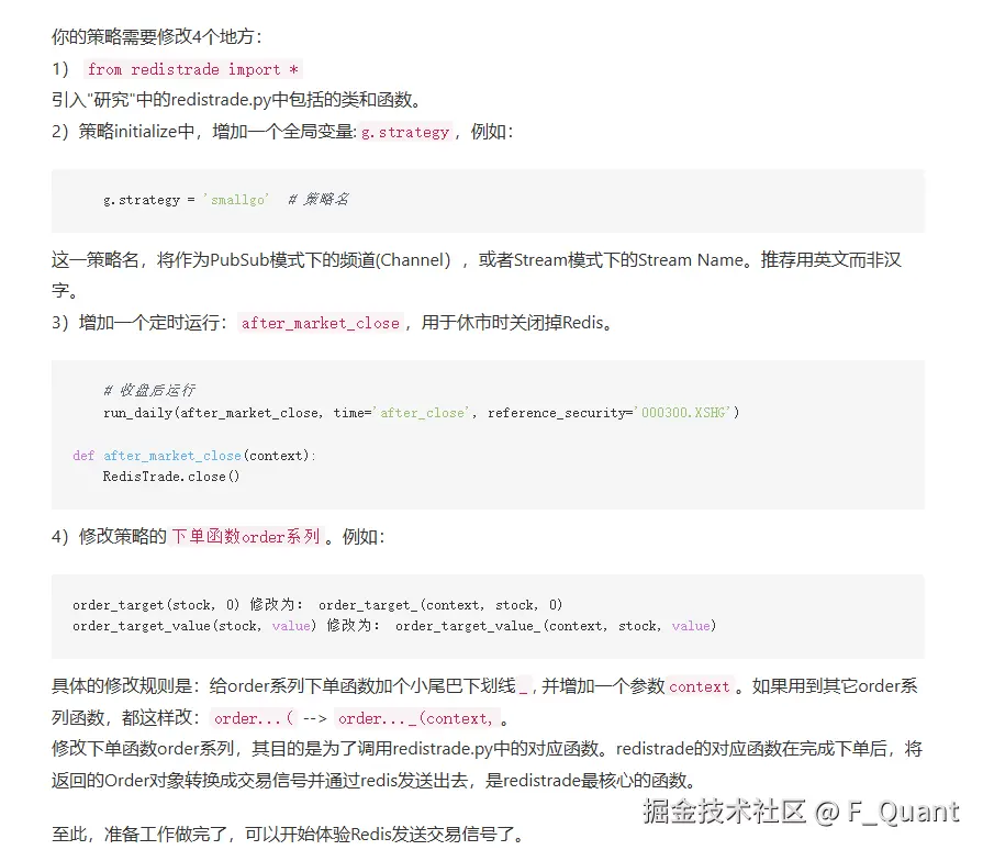 redistrade.py将你的redis服务器参数修改好。② 将 redistrade.py 上传聚宽的研究环境。③策略怎么改?参考蒋老师的 (链接放评论区,也可以看截图)。注:如果想要实时信号,需要开通聚宽会员。