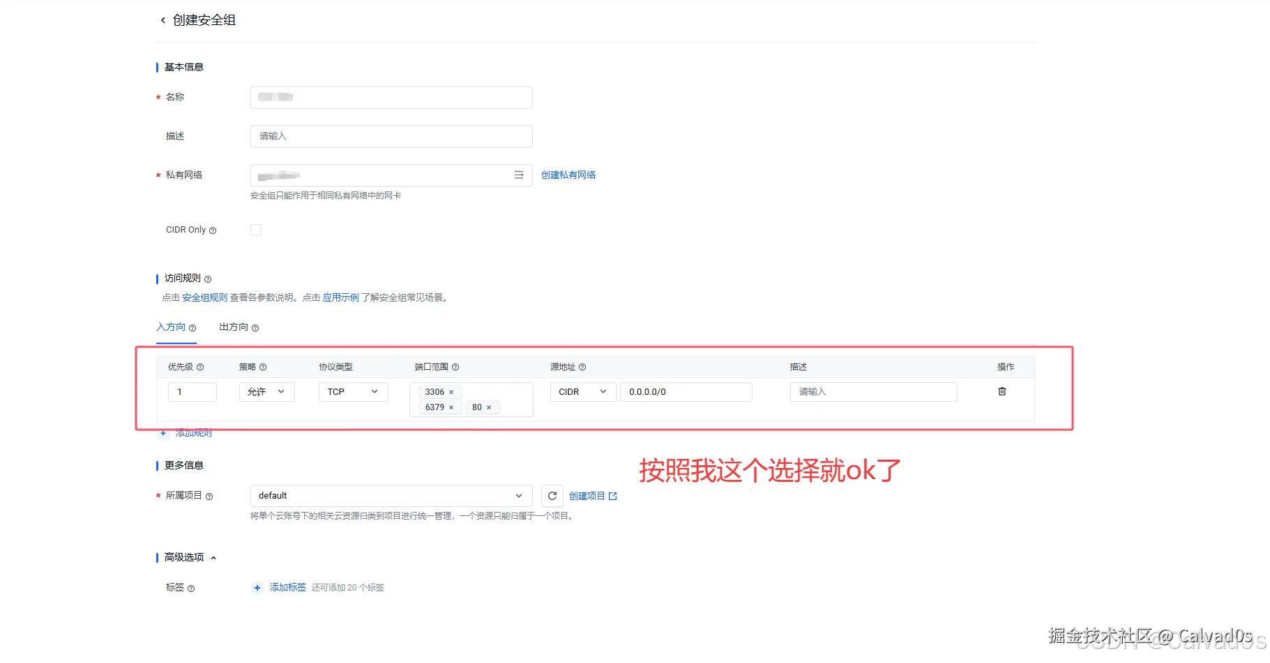 云服务器如何开放安全组? Calvad0s 2026-01-17 30 阅读1分钟 先说说为什么要开放安全组,这个东西类似于防火墙,如果你不开放mysql3306、redis6379等端口访问权限,那么你是无法连接到云服务器上mysql、redis等服务的,所以购买云服务器并安全完一系列中间件后,必须开放相关端口的安全组。 我们这里拿火山引擎云服务器演示(阿里云、腾讯云操作都一样的): 点击确定即可。
