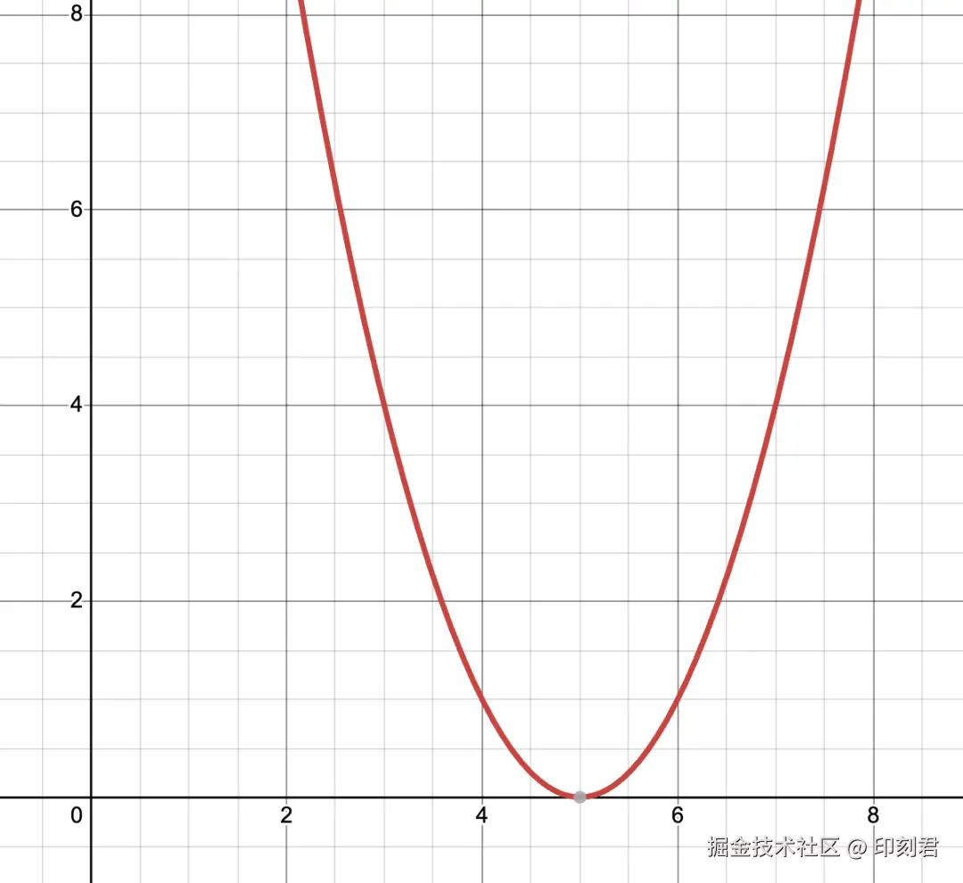 导数是这个抛物线上的斜率, 在最低点左侧, 斜率为负, 意味着增大 x 可以使损失下降; 在最低点右侧, 斜率为正, 意味着可以减小 x 的值使损失下降. 最低点斜率为 0, 损失最小.