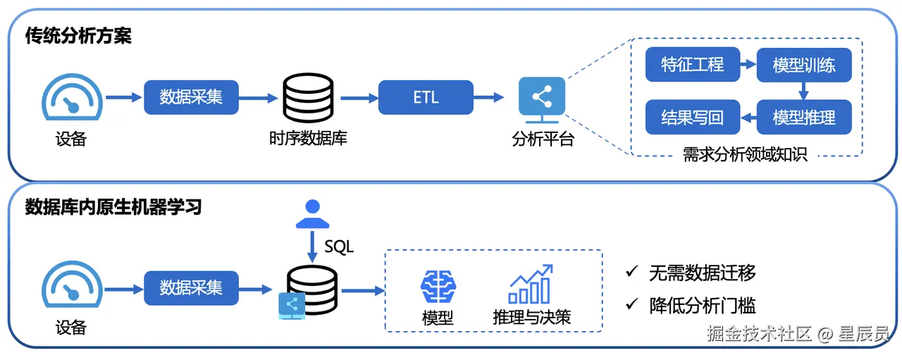 - 避免数据迁移:使用 IoTDB 原生机器学习可以将存储在 IoTDB 中的数据直接应用于机器学习模型的推理,无需将数据移动到单独的机器学习服务平台,从而加速数据处理、提高安全性并降低成本。
