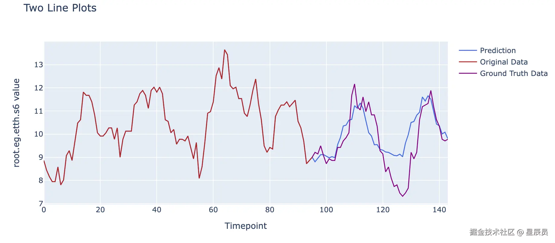 在该数据集上,IoTDB-ML的模型推理功能可以通过以往A相电压,B相电压和C相电压的数值和对应时间戳,预测未来一段时间内的C相电压,赋能变电站的监视管理。