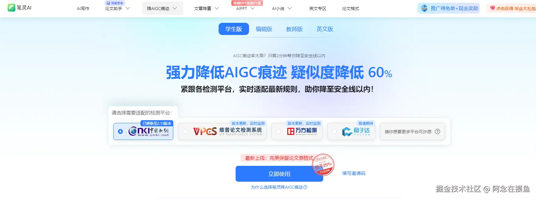 平台针对性强。它支持知网、维普、万方三大主流检测平台的算法,我选的知网,论文降之前ai率是50%多,降完是6.3%,效果很好