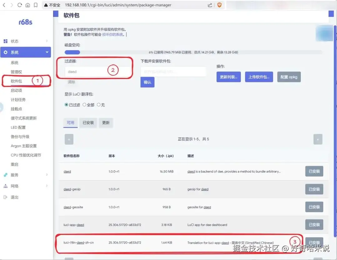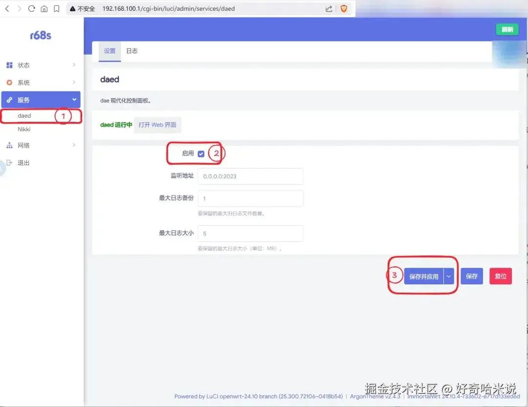 现在访问路由器的2023端口,开始配置 daed.