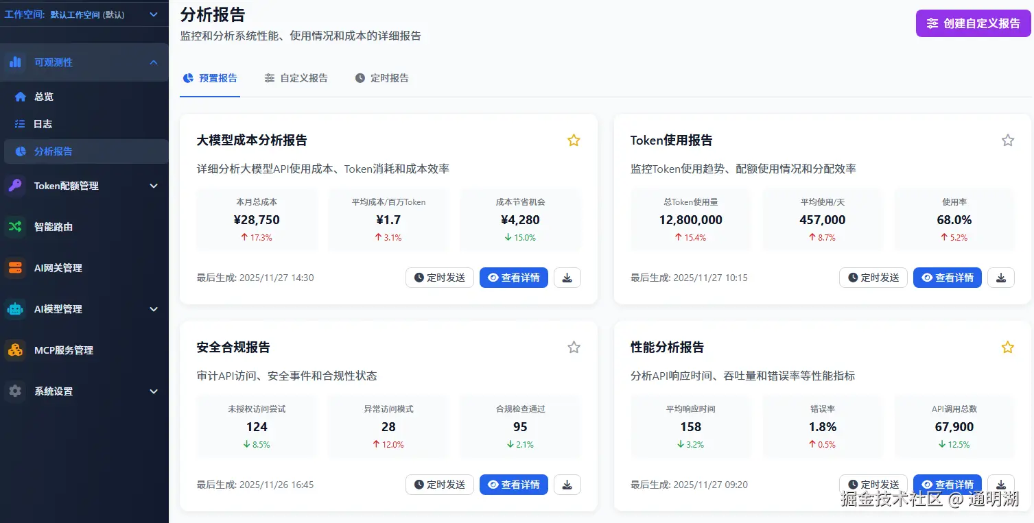 - 多维度分析报告: 提供全面的数据分析与报告体系,例如成本分析报告:大模型调用成本结构、趋势预测与优化建议;Token使用状况报告:Token 消耗模式分析、异常检测与使用效率评估;安全合规报告:访问控制审计、数据安全合规性检查; 性能分析报告:系统响应时间、吞吐量、资源利用率等关键指标.