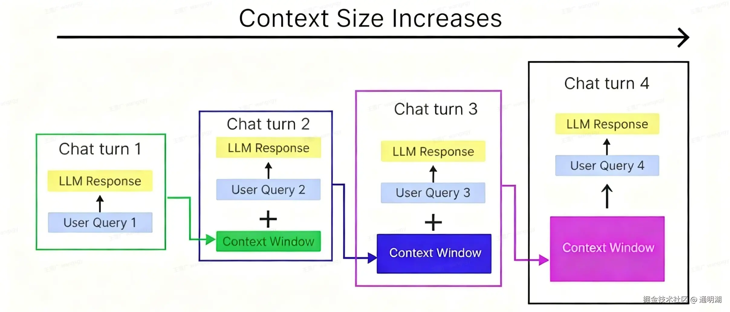 - Token"滚雪球"效应:Token消耗量可能因用户、功能或工作流程的不同而有巨大差异,某个功能可能悄无声息地消耗掉另一个功能的10倍Token,使用量也可能随用户行为意外激增。电商客服场景中,一个完整的用户咨询平均需要8-12轮对话。如果每次都将完整历史对话传给大模型,Token消耗会呈几何级增长。