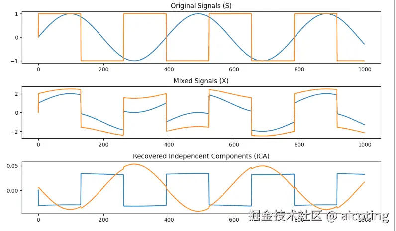 运行结果中,第一幅图展示原始独立信号,第二幅图为混合信号,第三幅图为 ICA 分离出的独立成分。可以看到,ICA 成功恢复了原始信号的独立性。