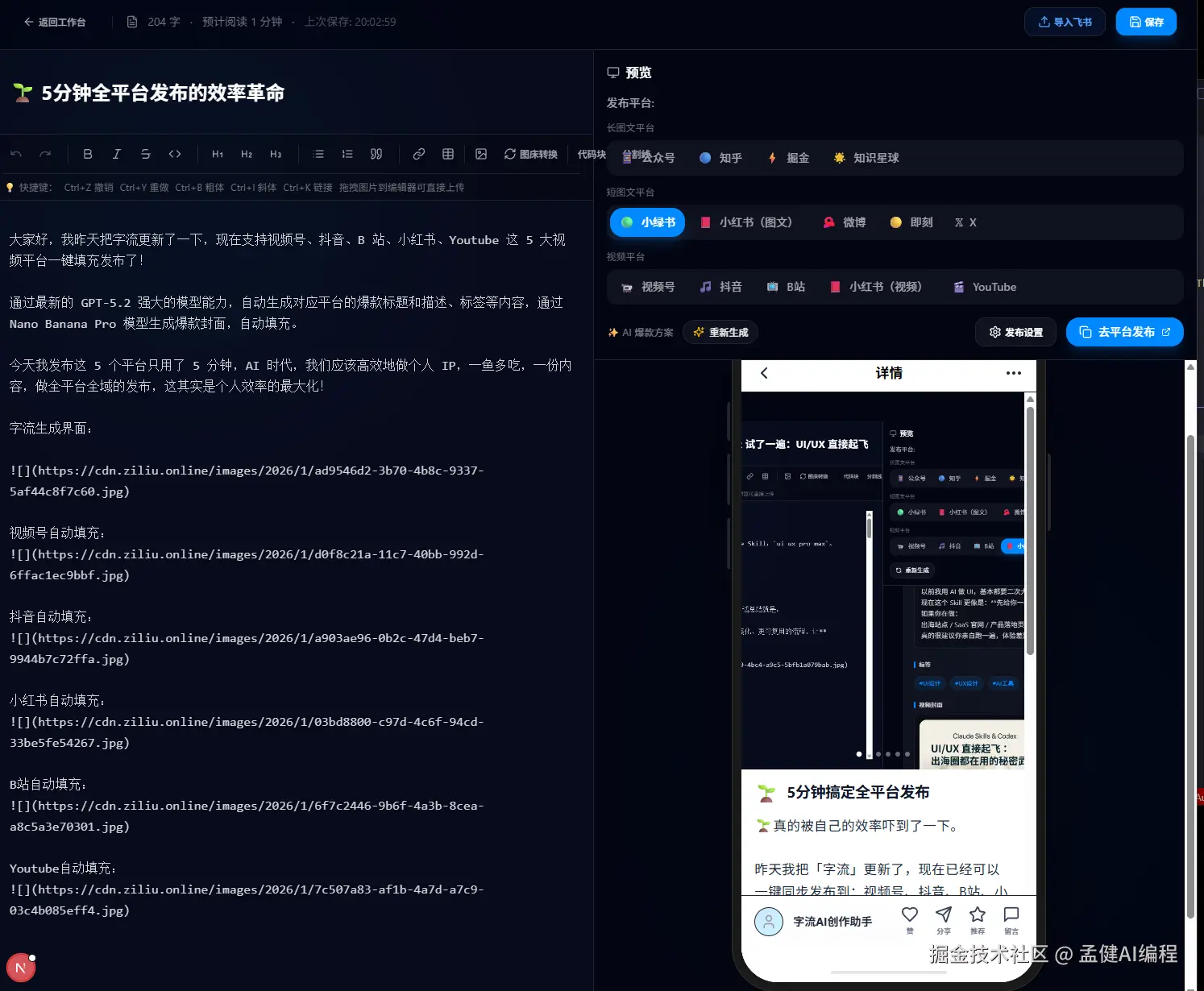 在飞书上写完初稿 → 通过 AI 知识库做润色 → 一键导入字流 → 发布 4 个长文平台 + 4 个短图文平台。