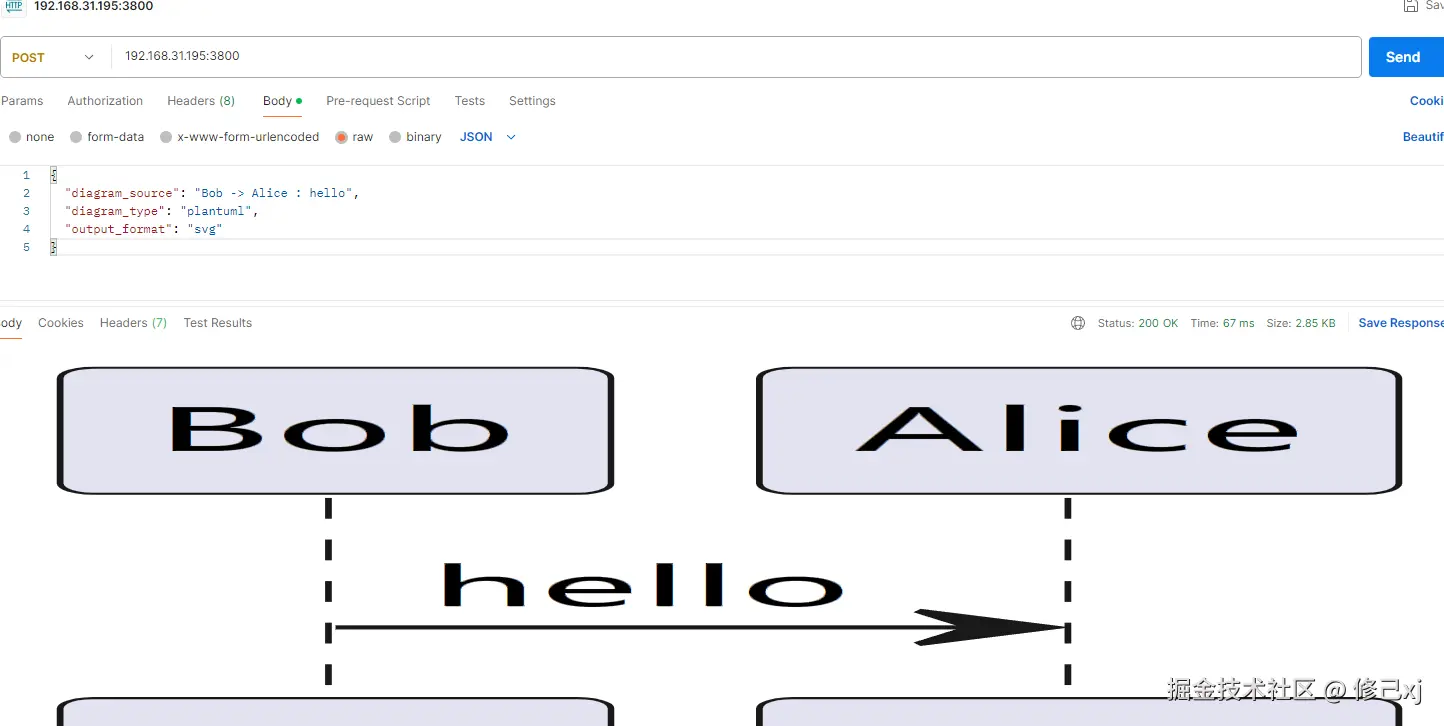 /plantuml表示使用 PlantUML 引擎 Content-Type: text/plain表示请求体是纯文本Accept: image/svg+xml表示希望返回 SVG