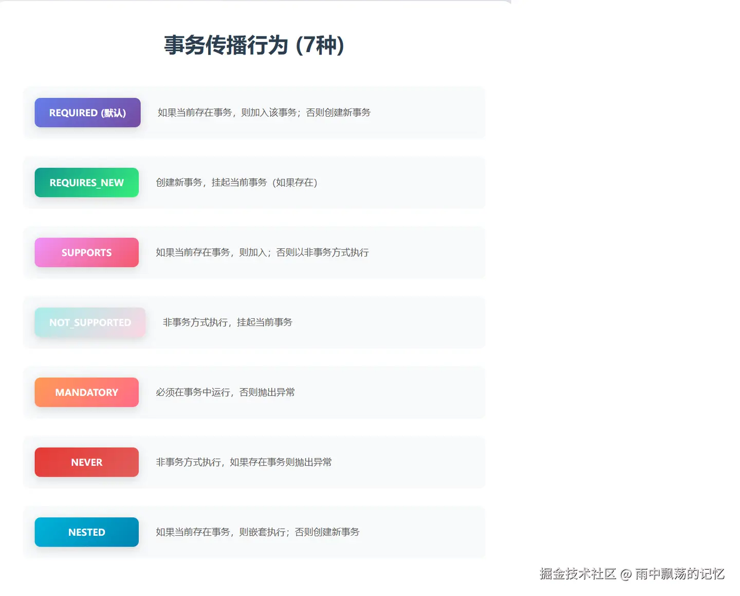 事务传播行为定义了多个事务方法相互调用时,事务如何传播。Spring提供了7种传播行为: