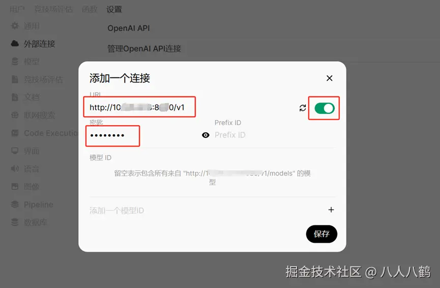 在Open-WebUI中添加一个外部连接,如图所示: