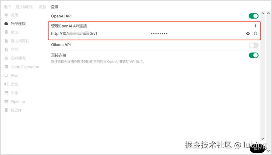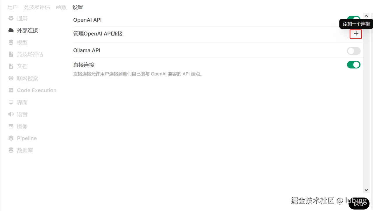 - 登录 Open-WebUI,进入“设置 - 外部连接”,选择添加新连接;