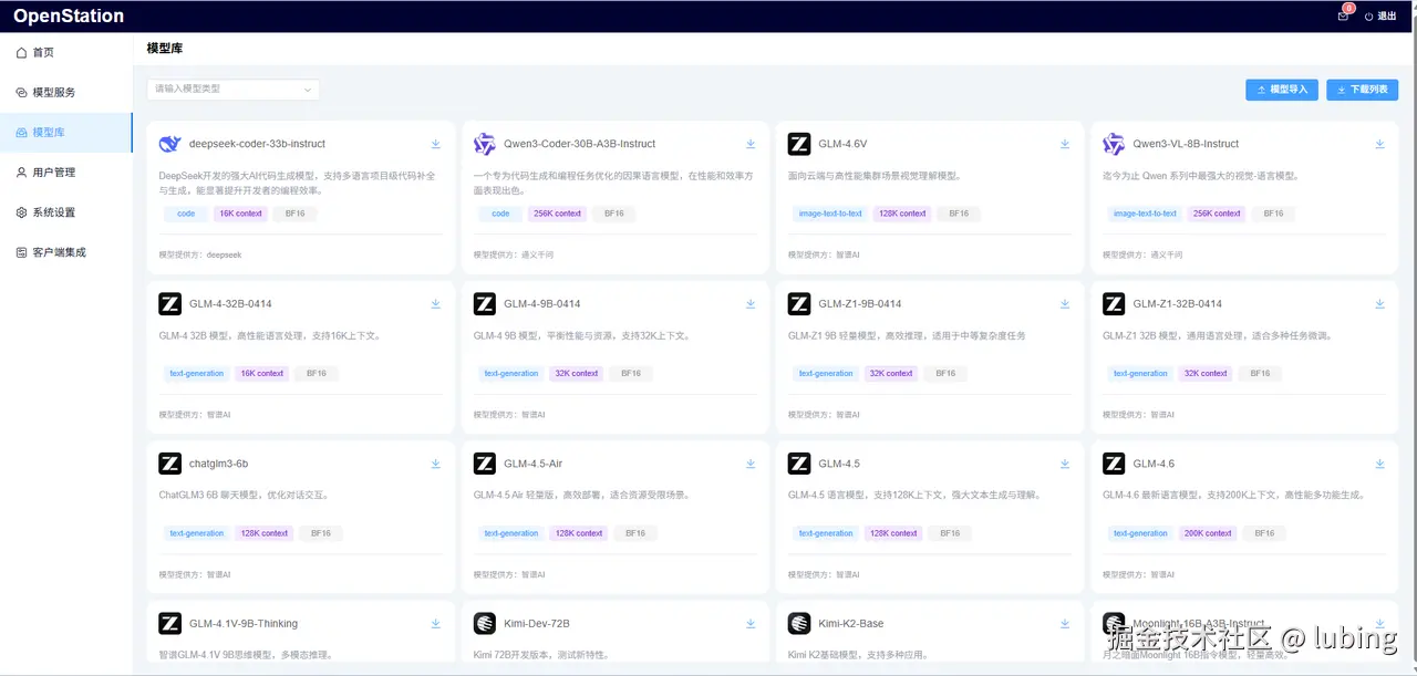 OpenStation 的模型库覆盖了日常开发所需的主流模型,从 DeepSeek-V3、Moonshot 到 ZhipuAI GLM4 系列,再到通义千问 Qwen3 全系列,所有模型均已完成平台适配,支持 “即下即用”。比如需要处理长文本知识库问答任务时,直接选择 Moonshot 模型,其 1024K 的超长上下文能力,能稳定解析 5000 字以上文档,准确率远超基础模型;而进行代码生成时,切换到 DeepSeek-V3,在 SWE-bench 测试中它的复杂算法实现逻辑完整性表现突出。如果有自定义模型需求,也可以通过本地路径上传,平台会自动完成元数据标准化和推理接口适配,无需手动修改配置。