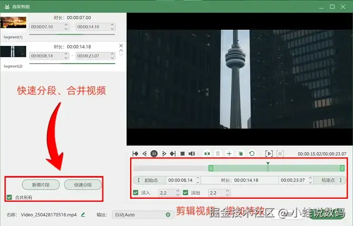 第三步:录屏结束后系统将自动跳转至预览界面,若用户对视频效果不满意,可通过下方 【高级剪辑】 功能进行后期处理,包括片段删除、分割及特效添加等操作。