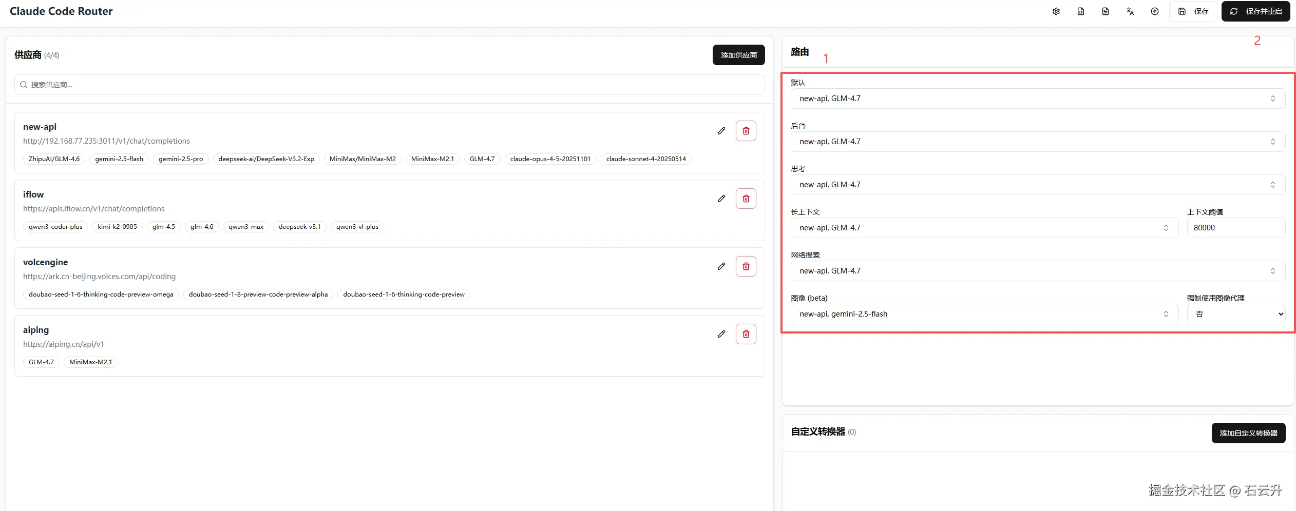 使用什么模型都在路由中这里配置,配置后记得点右上角的保存并重启。重启后,ccr code里运行的模型会自动更新。