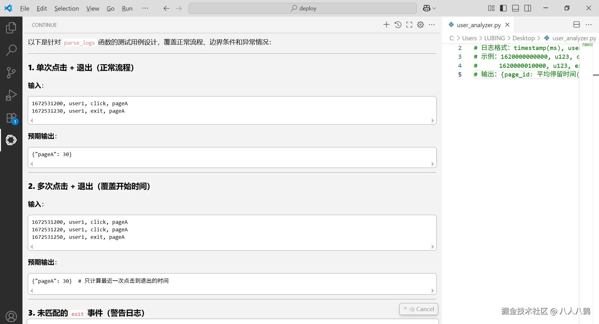 光说不练假把式,以开发一个 "用户行为分析工具" 的核心模块为例,看看集成后的 VSCode 能发挥多大作用。这个模块需要实现:从日志文件解析用户行为(点击、停留、退出),计算各页面的平均停留时间,最后生成 JSON 统计结果。