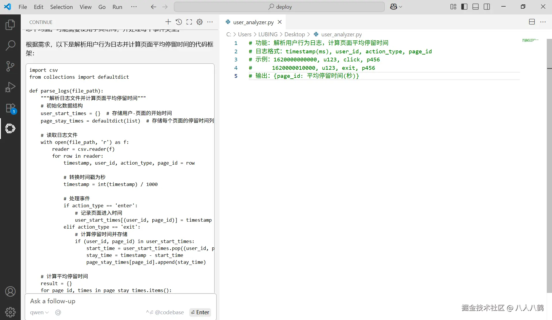 在 VSCode 里新建user_analyzer.py,输入注释,然后在 Continue 面板输入 "根据注释生成代码框架",几秒后模型返回了结构: