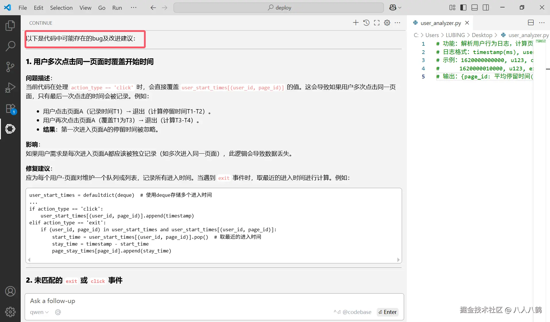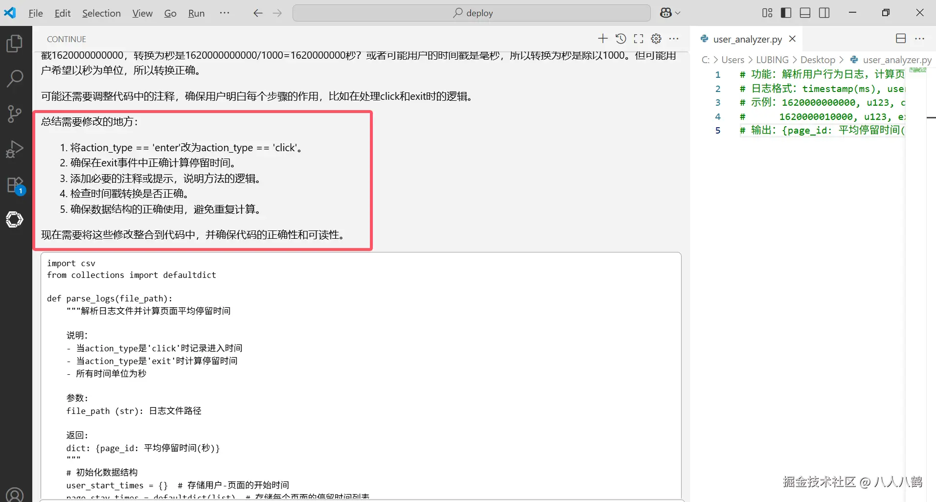 在函数内输入 "# 实现:当action_type是click时记录进入时间,exit时计算停留时间",并在面板提示" 完善这个方法 "。