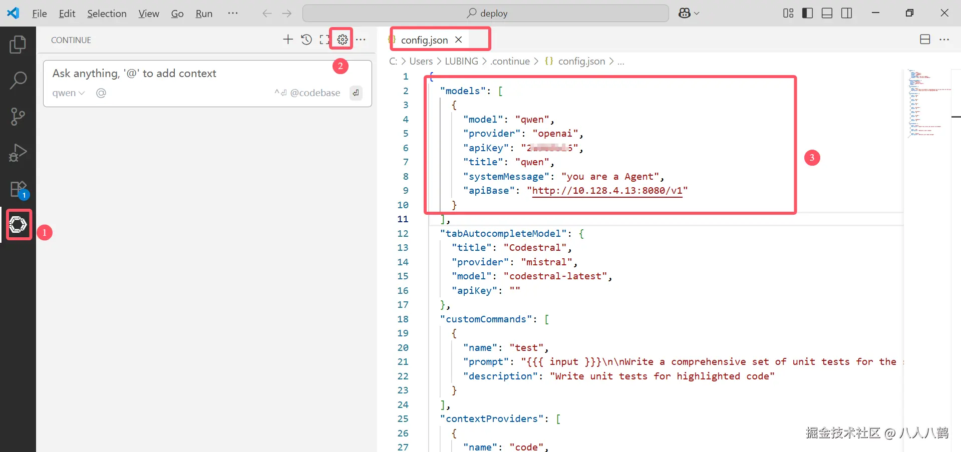 - 配置模型连接:按照图中顺序依次点击图标,会打开config.json配置文件。重点改以下红色框中的几个字段(参考OpenStation平台中模型服务信息进行修改):