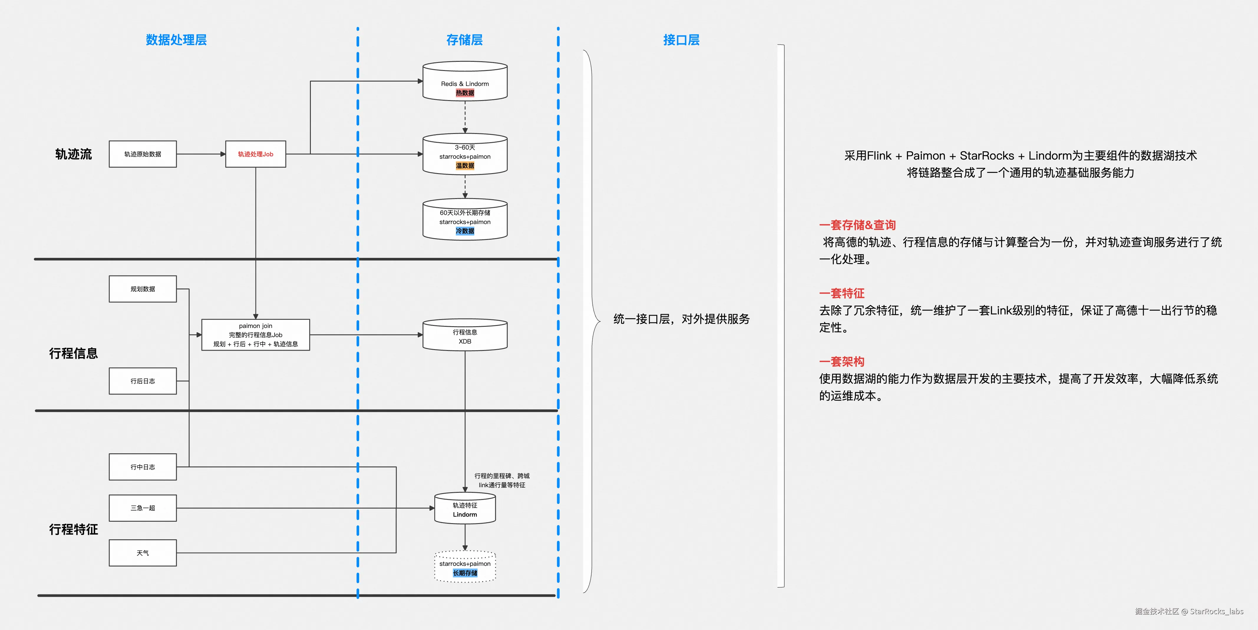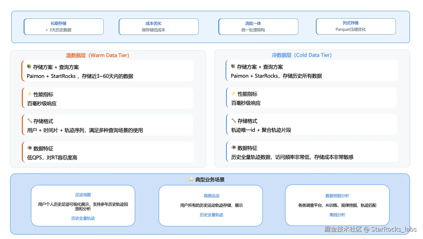 面对轨迹数据“高实时、高并发、长周期存储”的典型特征,高德团队以访问跨度为依据完成热/温/冷分层,并以 Apache Paimon + StarRocks 构建统一的数据底座,支撑轨迹数据的近实时写入与高性能查询。