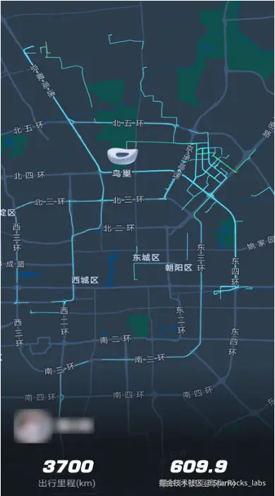 同时,高德地图会将用户的轨迹点与道路进行实时轨迹匹配,从而渲染出“足迹地图”的背景图。以下图为例,该图展示了一位用户在北京范围内行走过道路的渲染效果。